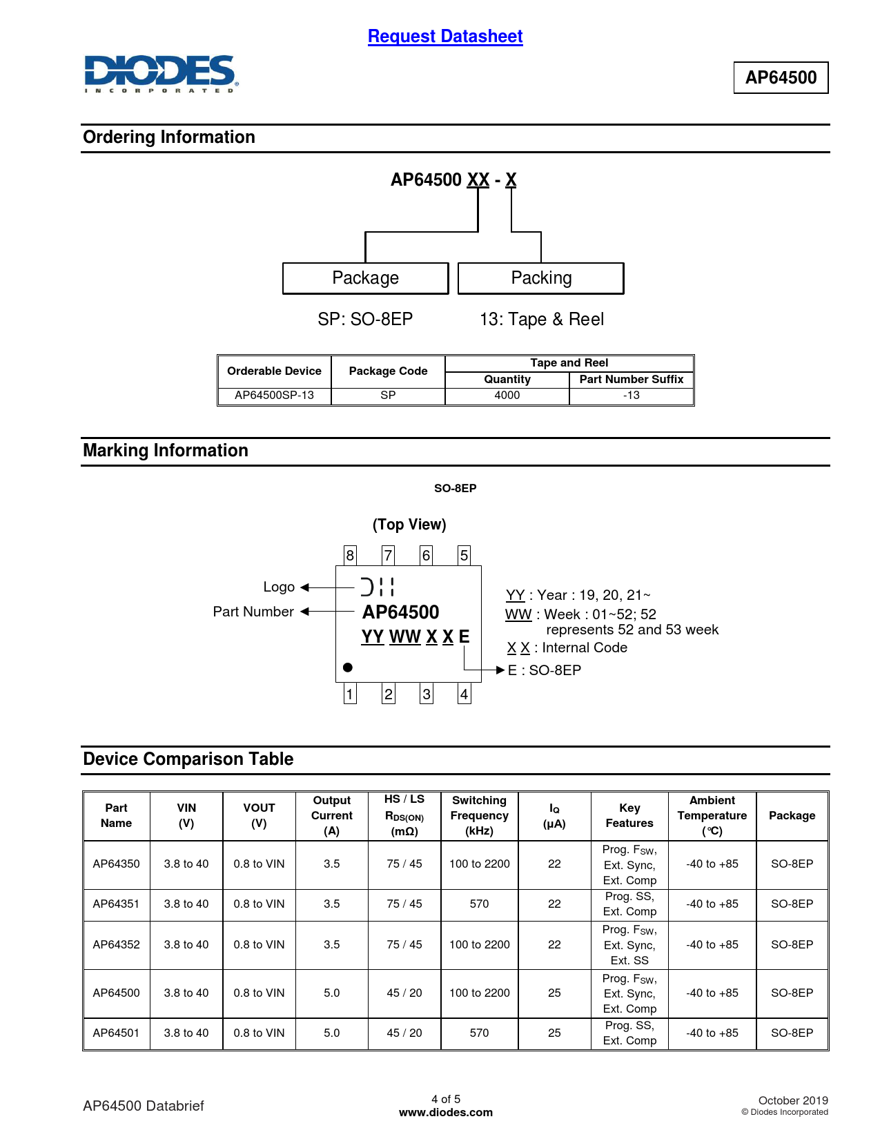 | Pages / Page | 5 / 4 — Request Datasheet. AP64500. Ordering Information. AP64500 XX - X. Tape … |