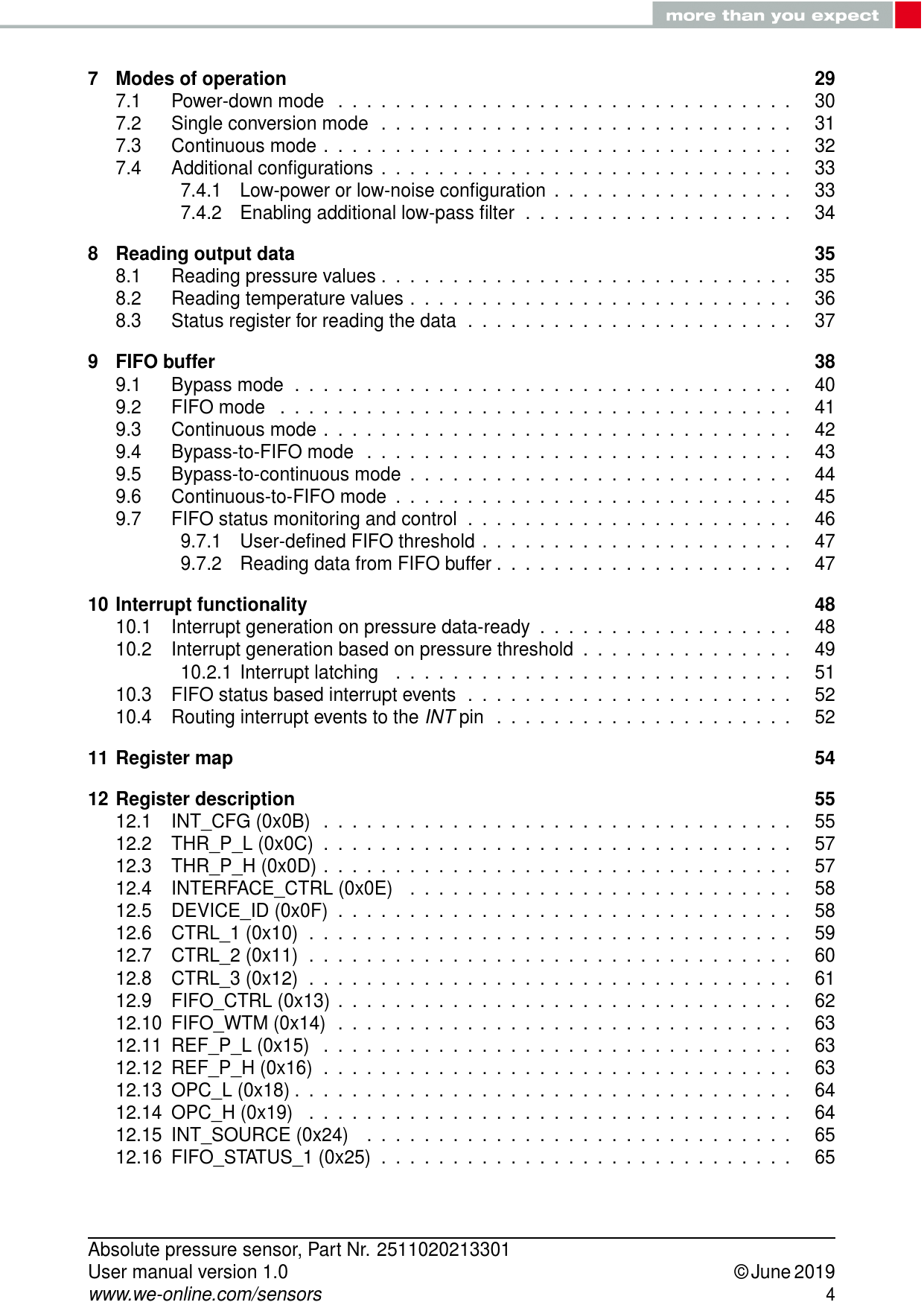 12.1 INT_CFG (0x0B) . 55 12.2 THR_P_L (0x0C) . 57 12.3 THR_P_H (0x0D) . 57 12.4 INTERFACE_CTRL (0x0E) . 58 12.5 DEVICE_ID (0x0F) . 58 12.6 CTRL_1 (0x10) . 59 12.7 CTRL_2 (0x11) . 60 12.8 CTRL_3 (0x12) . 61 12.9 FIFO_CTRL (0x13) . 62 12.10 FIFO_WTM (0x14) . 63 12.11 REF_P_L (0x15) . 63 12.12 REF_P_H (0x16) . 63 12.13 OPC_L (0x18) . 64 12.14 OPC_H (0x19) . 64 12.15 INT_SOURCE (0x24) . 65 12.16 FIFO_STATUS_1 (0x25) . 65 Absolute pressure sensor, Part Nr. 2511020213301 User manual version 1.0 © June 2019 www.we-online.com/sensors 4 Document Outline Introduction Application Key features Ordering information Block diagram Operational functionality MEMS Cell ASIC Calibration Digital filtering FIFO memory Filtering chain and data path Sensor specifications General information Absolute maximum ratings Pressure sensor specification Temperature sensor specification Electrical specifications Pinning information Pin configuration Pin description Digital interface General characteristics [fig:pinout]SDA and [fig:pinout]SCL logic levels Communication phase Idle state START(S) and STOP(P) condition Data validity Byte format Acknowledge(ACK) and No-Acknowledge(NACK) Slave address for the sensor Read/Write operation I2C timing parameters Application circuit Quick start guide Power-up sequence Communication with host controller Reboot Software reset Sensor operation: single conversion mode Sensor operation: continuous mode Power-off sequence Modes of operation Power-down mode Single conversion mode Continuous mode Additional configurations Low-power or low-noise configuration Enabling additional low-pass filter Reading output data Reading pressure values Reading temperature values Status register for reading the data FIFO buffer Bypass mode FIFO mode Continuous mode Bypass-to-FIFO mode Bypass-to-continuous mode Continuous-to-FIFO mode FIFO status monitoring and control User-defined FIFO threshold Reading data from FIFO buffer Interrupt functionality Interrupt generation on pressure data-ready Interrupt generation based on pressure threshold Interrupt latching FIFO status based interrupt events Routing interrupt events to the [fig:pinout]INT pin Register map Register description INT_CFG (0x0B) THR_P_L (0x0C) THR_P_H (0x0D) INTERFACE_CTRL (0x0E) DEVICE_ID (0x0F) CTRL_1 (0x10) CTRL_2 (0x11) CTRL_3 (0x12) FIFO_CTRL (0x13) FIFO_WTM (0x14) REF_P_L (0x15) REF_P_H (0x16) OPC_L (0x18) OPC_H (0x19) INT_SOURCE (0x24) FIFO_STATUS_1 (0x25) FIFO_STATUS_2 (0x26) STATUS (0x27) DATA_P_XL (0x28) DATA_P_L (0x29) DATA_P_H (0x2A) DATA_T_L (0x2B) DATA_T_H (0x2C) FIFO_DATA_P_XL (0x78) FIFO_DATA_P_L (0x79) FIFO_DATA_P_H (0x7A) FIFO_DATA_T_L (0x7B) FIFO_DATA_T_H (0x7A) Physical dimensions Sensor drawing Footprint Manufacturing information Moisture sensitivity level Soldering Reflow soldering Cleaning and washing Potting and coating Storage conditions Handling Important notes General customer responsibility Customer responsibility related to specific, in particular safety-relevant applications Best care and attention Customer support for product specifications Product improvements Product life cycle Property rights General terms and conditions Legal notice Exclusion of liability Suitability in customer applications Usage restriction License agreement for Würth Elektronik eiSos GmbH & Co. KG sensor product software and source code Limited license Usage and obligations Ownership Disclaimer of warranty Limitation of liability Applicable law and jurisdiction Severability clause Miscellaneous