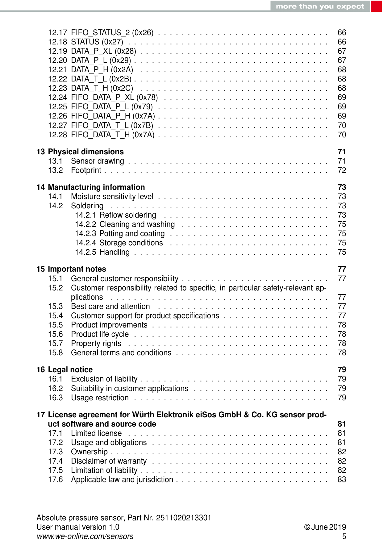 17.1 Limited license . 81 17.2 Usage and obligations . 81 17.3 Ownership . 82 17.4 Disclaimer of warranty . 82 17.5 Limitation of liability . 82 17.6 Applicable law and jurisdiction . 83 Absolute pressure sensor, Part Nr. 2511020213301 User manual version 1.0 © June 2019 www.we-online.com/sensors 5 Document Outline Introduction Application Key features Ordering information Block diagram Operational functionality MEMS Cell ASIC Calibration Digital filtering FIFO memory Filtering chain and data path Sensor specifications General information Absolute maximum ratings Pressure sensor specification Temperature sensor specification Electrical specifications Pinning information Pin configuration Pin description Digital interface General characteristics [fig:pinout]SDA and [fig:pinout]SCL logic levels Communication phase Idle state START(S) and STOP(P) condition Data validity Byte format Acknowledge(ACK) and No-Acknowledge(NACK) Slave address for the sensor Read/Write operation I2C timing parameters Application circuit Quick start guide Power-up sequence Communication with host controller Reboot Software reset Sensor operation: single conversion mode Sensor operation: continuous mode Power-off sequence Modes of operation Power-down mode Single conversion mode Continuous mode Additional configurations Low-power or low-noise configuration Enabling additional low-pass filter Reading output data Reading pressure values Reading temperature values Status register for reading the data FIFO buffer Bypass mode FIFO mode Continuous mode Bypass-to-FIFO mode Bypass-to-continuous mode Continuous-to-FIFO mode FIFO status monitoring and control User-defined FIFO threshold Reading data from FIFO buffer Interrupt functionality Interrupt generation on pressure data-ready Interrupt generation based on pressure threshold Interrupt latching FIFO status based interrupt events Routing interrupt events to the [fig:pinout]INT pin Register map Register description INT_CFG (0x0B) THR_P_L (0x0C) THR_P_H (0x0D) INTERFACE_CTRL (0x0E) DEVICE_ID (0x0F) CTRL_1 (0x10) CTRL_2 (0x11) CTRL_3 (0x12) FIFO_CTRL (0x13) FIFO_WTM (0x14) REF_P_L (0x15) REF_P_H (0x16) OPC_L (0x18) OPC_H (0x19) INT_SOURCE (0x24) FIFO_STATUS_1 (0x25) FIFO_STATUS_2 (0x26) STATUS (0x27) DATA_P_XL (0x28) DATA_P_L (0x29) DATA_P_H (0x2A) DATA_T_L (0x2B) DATA_T_H (0x2C) FIFO_DATA_P_XL (0x78) FIFO_DATA_P_L (0x79) FIFO_DATA_P_H (0x7A) FIFO_DATA_T_L (0x7B) FIFO_DATA_T_H (0x7A) Physical dimensions Sensor drawing Footprint Manufacturing information Moisture sensitivity level Soldering Reflow soldering Cleaning and washing Potting and coating Storage conditions Handling Important notes General customer responsibility Customer responsibility related to specific, in particular safety-relevant applications Best care and attention Customer support for product specifications Product improvements Product life cycle Property rights General terms and conditions Legal notice Exclusion of liability Suitability in customer applications Usage restriction License agreement for Würth Elektronik eiSos GmbH & Co. KG sensor product software and source code Limited license Usage and obligations Ownership Disclaimer of warranty Limitation of liability Applicable law and jurisdiction Severability clause Miscellaneous