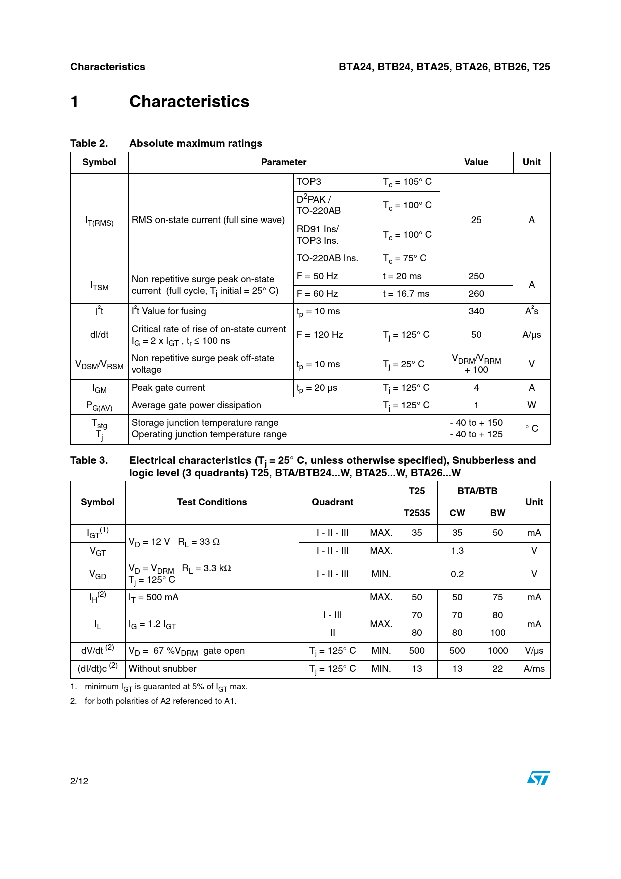 link to page 2 link to page 2 CharacteristicsBTA24, BTB24, BTA25, BTA26, BTB26, T251 CharacteristicsTable 2.Absolute maximum ratingsSymbolParameterValueUnit TOP3 Tc = 105° C D2PAK / T TO-220AB c = 100° C IT(RMS) RMS on-state current (full sine wave) 25 A RD91 Ins/ T TOP3 Ins. c = 100° C TO-220AB Ins. Tc = 75° C Non repetitive surge peak on-state F = 50 Hz t = 20 ms 250 ITSM A current (full cycle, Tj initial = 25° C) F = 60 Hz t = 16.7 ms 260 I²t I²t Value for fusing tp = 10 ms 340 A²s Critical rate of rise of on-state current dI/dt F = 120 Hz T I j = 125° C 50 A/µs G = 2 x IGT , tr ≤ 100 ns Non repetitive surge peak off-state V V DRM/VRRM DSM/VRSM t V voltage p = 10 ms Tj = 25° C + 100 IGM Peak gate current tp = 20 µs Tj = 125° C 4 A PG(AV) Average gate power dissipation Tj = 125° C 1 W Tstg Storage junction temperature range - 40 to + 150 ° C Tj Operating junction temperature range - 40 to + 125 Table 3.Electrical characteristics (Tj = 25° C, unless otherwise specified), Snubberless and logic level (3 quadrants) T25, BTA/BTB24...W, BTA25...W, BTA26...WT25BTA/BTBSymbolTest ConditionsQuadrantUnitT2535CWBW I (1) GT I - II - III MAX. 35 35 50 mA VD = 12 V RL = 33 Ω VGT I - II - III MAX. 1.3 V V V D = VDRM RL = 3.3 kΩ GD I - II - III MIN. 0.2 V Tj = 125° C I (2) H IT = 500 mA MAX. 50 50 75 mA I - III 70 70 80 IL IG = 1.2 IGT MAX. mA II 80 80 100 dV/dt (2) VD = 67 %VDRM gate open Tj = 125° C MIN. 500 500 1000 V/µs (dI/dt)c (2) Without snubber Tj = 125° C MIN. 13 13 22 A/ms 1. minimum IGT is guaranted at 5% of IGT max. 2. for both polarities of A2 referenced to A1. 2/12 Document Outline Table 1. Device summary 1 Characteristics Table 2. Absolute maximum ratings Table 3. Electrical characteristics (Tj = 25˚ C, unless otherwise specified), Snubberless and logic level (3 quadrants) T25, BTA/BTB24...W, BTA25...W, BTA26...W Table 4. Electrical characteristics (Tj = 25˚ C, unless otherwise specified), standard (4 quadrants), BTB24...B, BTA25...B, BTA26...B, BTB26...B Table 5. Static characteristics Table 6. Thermal resistance Figure 1. Maximum power dissipation versus RMS on-state current (full cycle) Figure 2. RMS on-state current versus case temperature (full cycle) Figure 3. D2PAK RMS on-state current versus ambient temperature (printed circuit board FR4, copper thickness: 35µm) (full cycle) Figure 4. Relative variation of thermal impedance versus pulse duration Figure 5. On-state characteristics (maximum values) Figure 6. Surge peak on-state current versus number of cycles Figure 7. Non-repetitive surge peak on-state current for a sinusoidal pulse with width tp < 10 ms and corresponding value of I2t Figure 8. Relative variation of gate trigger current, holding current and latching current versus junction temperature (typical values) Figure 9. Relative variation of critical rate of decrease of main current versus (dV/dt)c (typical values) Figure 10. Relative variation of critical rate of decrease of main current versus Tj Figure 11. D2PAK thermal resistance junction to ambient versus copper surface under tab (printed circuit board FR4, copper thickness: 35 µm) 2 Ordering information scheme Figure 12. BTA and BTB series Figure 13. T25 series 3 Package information Table 7. D2PAK dimensions Figure 14. D2PAK footprint dimensions (in millimeters) Table 8. RD91 dimensions Table 9. TOP3 (insulated and non_insulated) dimensions Table 10. TO-220AB (insulated and non-insulated) dimensions 4 Ordering information Table 11. Ordering information 5 Revision history Table 12. Revision history