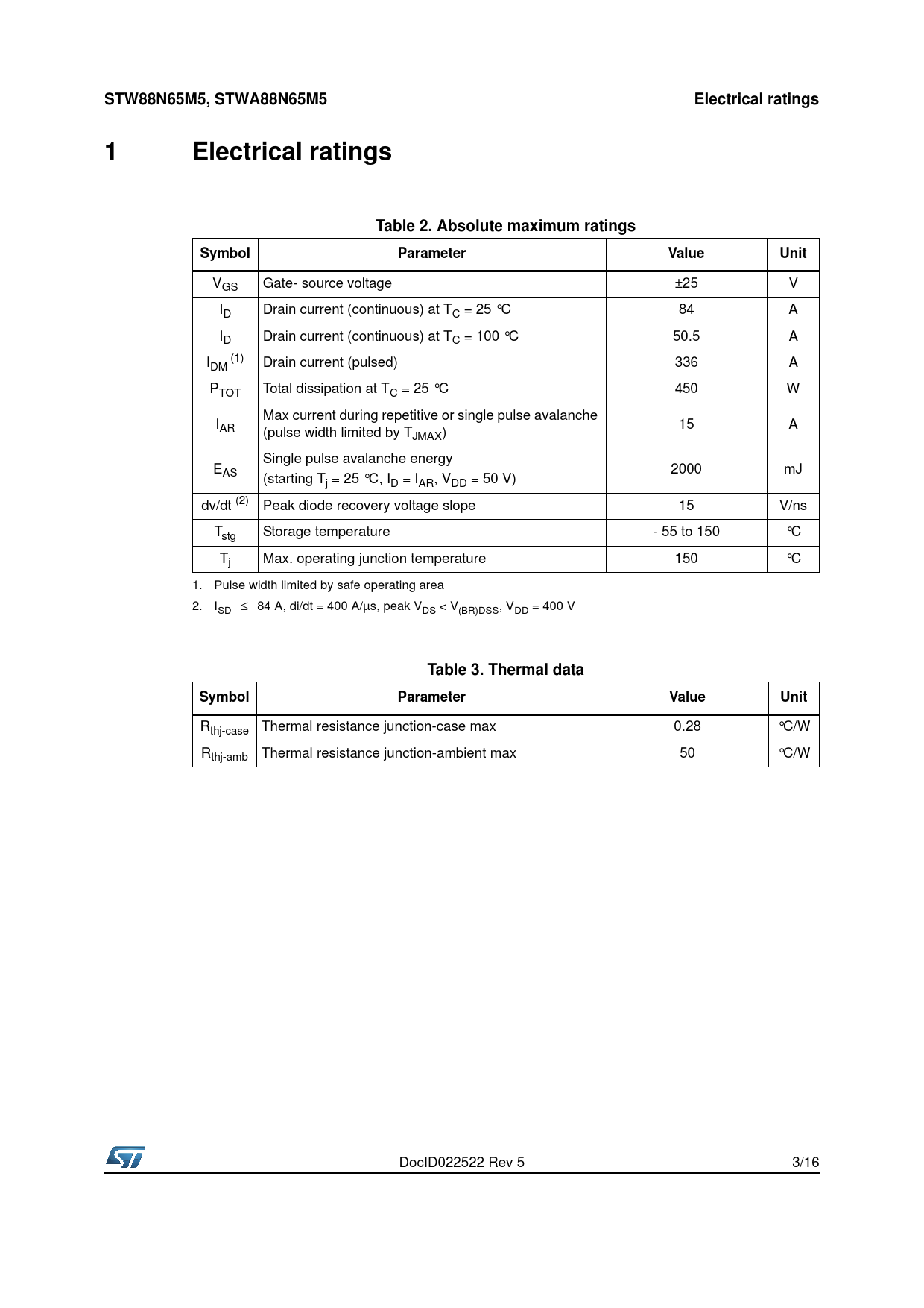 STW88N65M5, STWA88N65M5. Electrical ratings. 1 Electrical. ratings. Table 2. Absolute maximum ratings. Symbol. Parameter. Value. Unit
