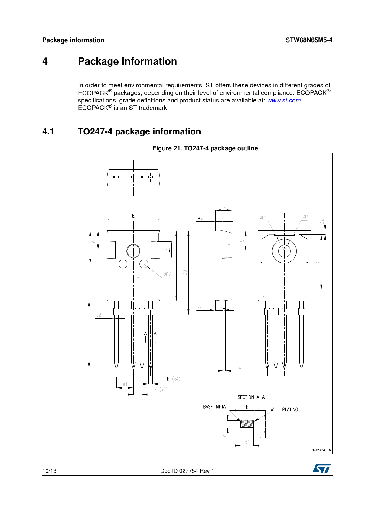Package informationSTW88N65M5-44 Packageinformation In order to meet environmental requirements, ST offers these devices in different grades of ECOPACK® packages, depending on their level of environmental compliance. ECOPACK® specifications, grade definitions and product status are available at: www.st.com. ECOPACK® is an ST trademark. 4.1TO247-4 package informationFigure 21. TO247-4 package outline B$ 10/13 Doc ID 027754 Rev 1 Document Outline Figure 1. Internal schematic diagram Table 1. Device summary 1 Electrical ratings Table 2. Absolute maximum ratings Table 3. Thermal data 2 Electrical characteristics Table 4. Static Table 5. Dynamic Table 6. Switching times Table 7. Source-drain diode 2.1 Electrical characteristics (curves) Figure 2. Safe operating area Figure 3. Thermal impedance Figure 4. Output characteristics Figure 5. Transfer characteristics Figure 6. Gate charge vs gate-source voltage Figure 7. Static drain-source on-resistance Figure 8. Capacitance variations Figure 9. Output capacitance stored energy Figure 10. Normalized gate threshold voltage vs temperature Figure 11. Normalized on-resistance vs temperature Figure 12. Source-drain diode forward characteristics Figure 13. Normalized V(BR)DSS vs temperature Figure 14. Switching losses vs gate resistance 3 Test circuits Figure 15. Switching times test circuit for resistive load Figure 16. Gate charge test circuit Figure 17. Test circuit for inductive load switching and diode recovery times Figure 18. Unclamped inductive load test circuit Figure 19. Unclamped inductive waveform Figure 20. Switching time waveform 4 Package information 4.1 TO247-4 package information Figure 21. TO247-4 package outline Table 8. TO247-4 package mechanical data 5 Revision history Table 9. Document revision history