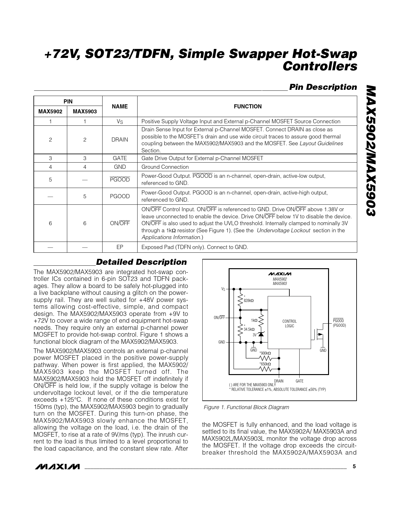 +72V, SOT23/TDFN, Simple Swapper Hot-Swap. Controllers. MAX5902/MAX5903. Pin Description. PIN. NAME. FUNCTION. MAX5902. MAX5903