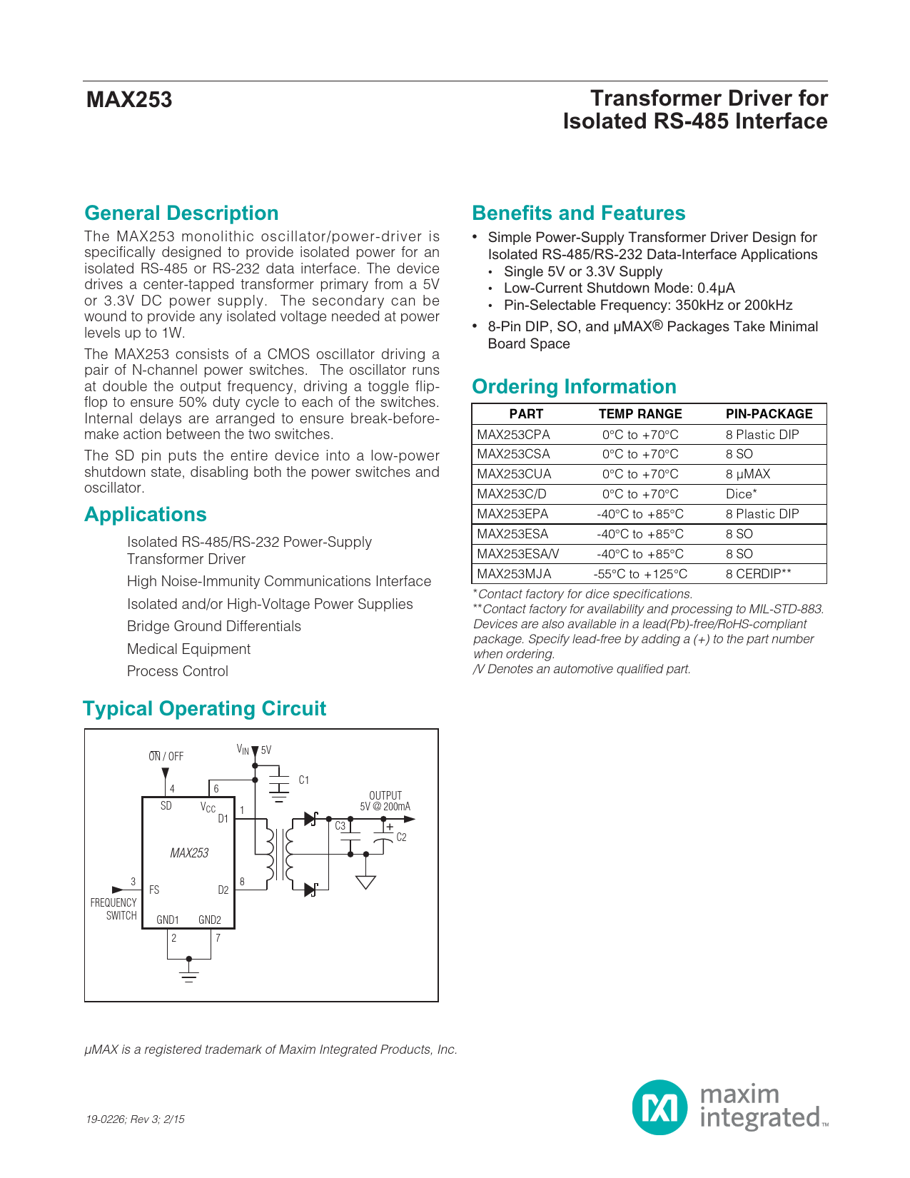 MAX253. Transformer Driver for. Isolated RS-485 Interface. General Description. Benefits and Features. Ordering Information