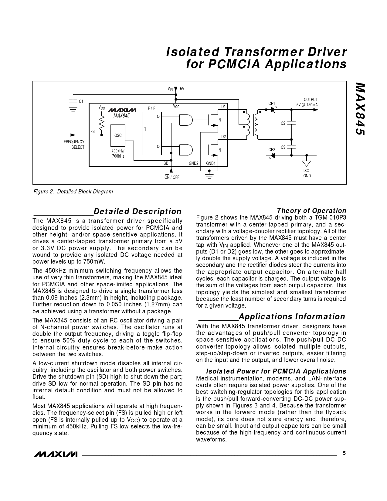 Isolated Transformer Driverfor PCMCIA ApplicationsMAX845 VIN 5V C1 OUTPUT CR1 V 5V @ 150mA V CC D1 CC F / F MAX845 Q N C2 FS T OSC D2 FREQUENCY SELECT Q C3 N 400kHz/ CR2 700kHz SD GND2 GND1 ISO ON / OFF GND Figure 2. Detailed Block Diagram _______________Detailed DescriptionTheory of Operation Figure 2 shows the MAX845 driving both a TGM-010P3 The MAX845 is a transformer driver specifically transformer with a center-tapped primary, and a sec- designed to provide isolated power for PCMCIA and ondary with a voltage-doubler rectifier topology. All of the other height- and/or space-sensitive applications. It transformers driven by the MAX845 must have a center drives a center-tapped transformer primary from a 5V tap with V or 3.3V DC power supply. The secondary can be IN applied. Whenever one of the MAX845 out- puts (D1 or D2) goes low, the other goes to approximate- wound to provide any isolated DC voltage needed at ly double the supply voltage. A voltage is induced in the power levels up to 750mW. secondary and the rectifier diodes steer the currents into The 450kHz minimum switching frequency allows the the appropriate output capacitor. On alternate half use of very thin transformers, making the MAX845 ideal cycles, each capacitor is charged. The output voltage is for PCMCIA and other space-limited applications. The the sum of the voltages from each output capacitor. This MAX845 is designed to drive a single transformer less topology yields the simplest and smallest transformer than 0.09 inches (2.3mm) in height, including package. because the least number of secondary turns is required Further reduction down to 0.050 inches (1.27mm) can for a given voltage. be achieved using a transformer without a package. __________Applications Information The MAX845 consists of an RC oscillator driving a pair of N-channel power switches. The oscillator runs at With the MAX845 transformer driver, designers have double the output frequency, driving a toggle flip-flop the advantages of push/pull converter topology in to ensure 50% duty cycle to each of the switches. space-sensitive applications. The push/pull DC-DC Internal circuitry ensures break-before-make action converter topology allows isolated multiple outputs, between the two switches. step-up/step-down or inverted outputs, easier filtering on the input and the output, and lower overall noise. A low-current shutdown mode disables all internal cir- cuitry, including the oscillator and both power switches. Isolated Power for PCMCIA Applications Drive the shutdown pin (SD) high to shut down the part; Medical instrumentation, modems, and LAN-interface drive SD low for normal operation. The SD pin has no cards often require isolated power supplies. One of the internal default condition and must not be allowed to best switching-regulator topologies for this application float. is the push/pull forward-converting DC-DC power sup- Most MAX845 applications will operate at high frequen- ply shown in Figures 3 and 4. Because the transformer cies. The frequency-select pin (FS) is pulled high or left works in the forward mode (rather than the flyback open (FS is internally pulled up to VCC) to operate at a mode), its core does not store energy and, therefore, minimum of 450kHz. Pulling FS low selects the low-fre- can be small. Input and output capacitors can be small quency state. because of the high-frequency and continuous-current waveforms. _______________________________________________________________________________________5
