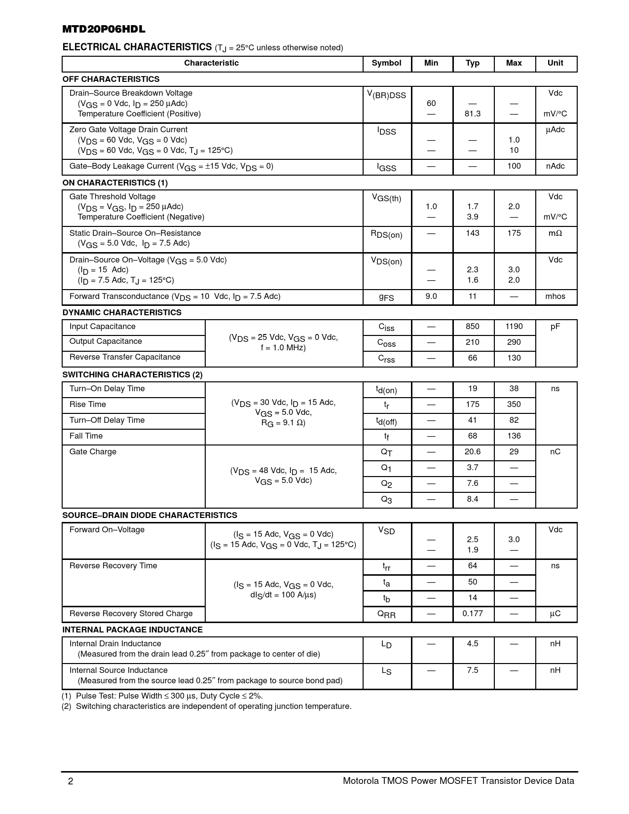 Internal Drain Inductance LD — 4.5 — nH (Measured from the drain lead 0.25″ from package to center of die) Internal Source Inductance LS — 7.5 — nH (Measured from the source lead 0.25″ from package to source bond pad) (1) Pulse Test: Pulse Width ≤ 300 µs, Duty Cycle ≤ 2%. (2) Switching characteristics are independent of operating junction temperature. 2 Motorola TMOS Power MOSFET Transistor Device Data