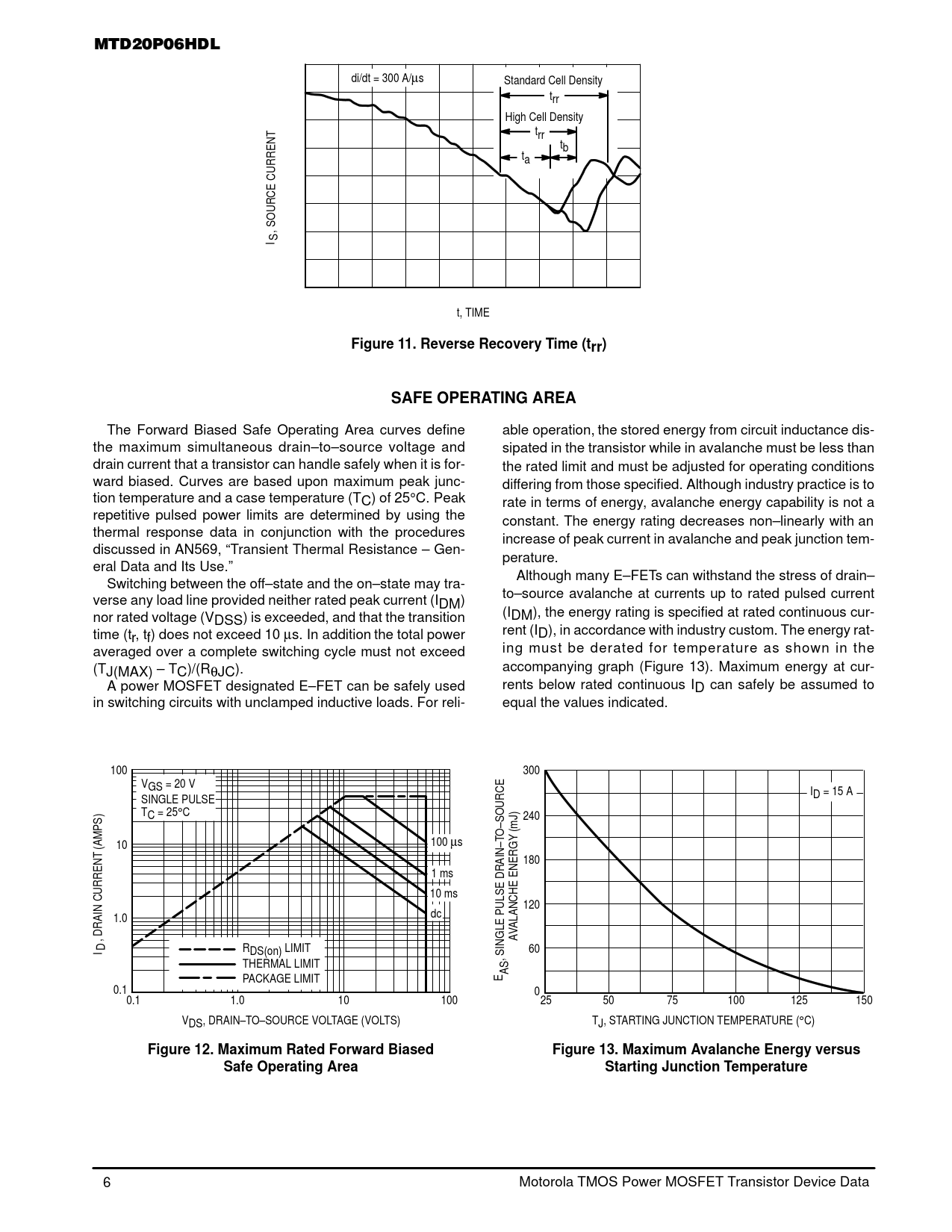 MTD20P06HDL di/dt = 300 A/µs Standard Cell Density trr High Cell Density trr tb ta , SOURCE CURRENT I S t, TIME Figure 11. Reverse Recovery Time (trr)SAFE OPERATING AREA The Forward Biased Safe Operating Area curves define able operation, the stored energy from circuit inductance dis- the maximum simultaneous drain–to–source voltage and sipated in the transistor while in avalanche must be less than drain current that a transistor can handle safely when it is for- the rated limit and must be adjusted for operating conditions ward biased. Curves are based upon maximum peak junc- differing from those specified. Although industry practice is to tion temperature and a case temperature (TC) of 25°C. Peak rate in terms of energy, avalanche energy capability is not a repetitive pulsed power limits are determined by using the constant. The energy rating decreases non–linearly with an thermal response data in conjunction with the procedures increase of peak current in avalanche and peak junction tem- discussed in AN569, “Transient Thermal Resistance – Gen- perature. eral Data and Its Use.” Although many E–FETs can withstand the stress of drain– Switching between the off–state and the on–state may tra- to–source avalanche at currents up to rated pulsed current verse any load line provided neither rated peak current (IDM) nor rated voltage (V (I DSS) is exceeded, and that the transition DM), the energy rating is specified at rated continuous cur- time (t rent (I r, tf) does not exceed 10 µs. In addition the total power D), in accordance with industry custom. The energy rat- averaged over a complete switching cycle must not exceed ing must be derated for temperature as shown in the (TJ(MAX) – TC)/(RθJC). accompanying graph (Figure 13). Maximum energy at cur- A power MOSFET designated E–FET can be safely used rents below rated continuous ID can safely be assumed to in switching circuits with unclamped inductive loads. For reli- equal the values indicated. 100 300 VGS = 20 V ID = 15 A SINGLE PULSE TC = 25°C 240 O–SOURCE (mJ) (AMPS) 10 100 µs 180 1 ms 10 ms 120 1.0 dc ALANCHE ENERGY V , DRAIN CURRENT A I D R 60 DS(on) LIMIT , SINGLE PULSE DRAIN–T THERMAL LIMIT AS PACKAGE LIMIT E 0.1 0 0.1 1.0 10 100 25 50 75 100 125 150 VDS, DRAIN–TO–SOURCE VOLTAGE (VOLTS) TJ, STARTING JUNCTION TEMPERATURE (°C) Figure 12. Maximum Rated Forward BiasedFigure 13. Maximum Avalanche Energy versusSafe Operating AreaStarting Junction Temperature 6 Motorola TMOS Power MOSFET Transistor Device Data