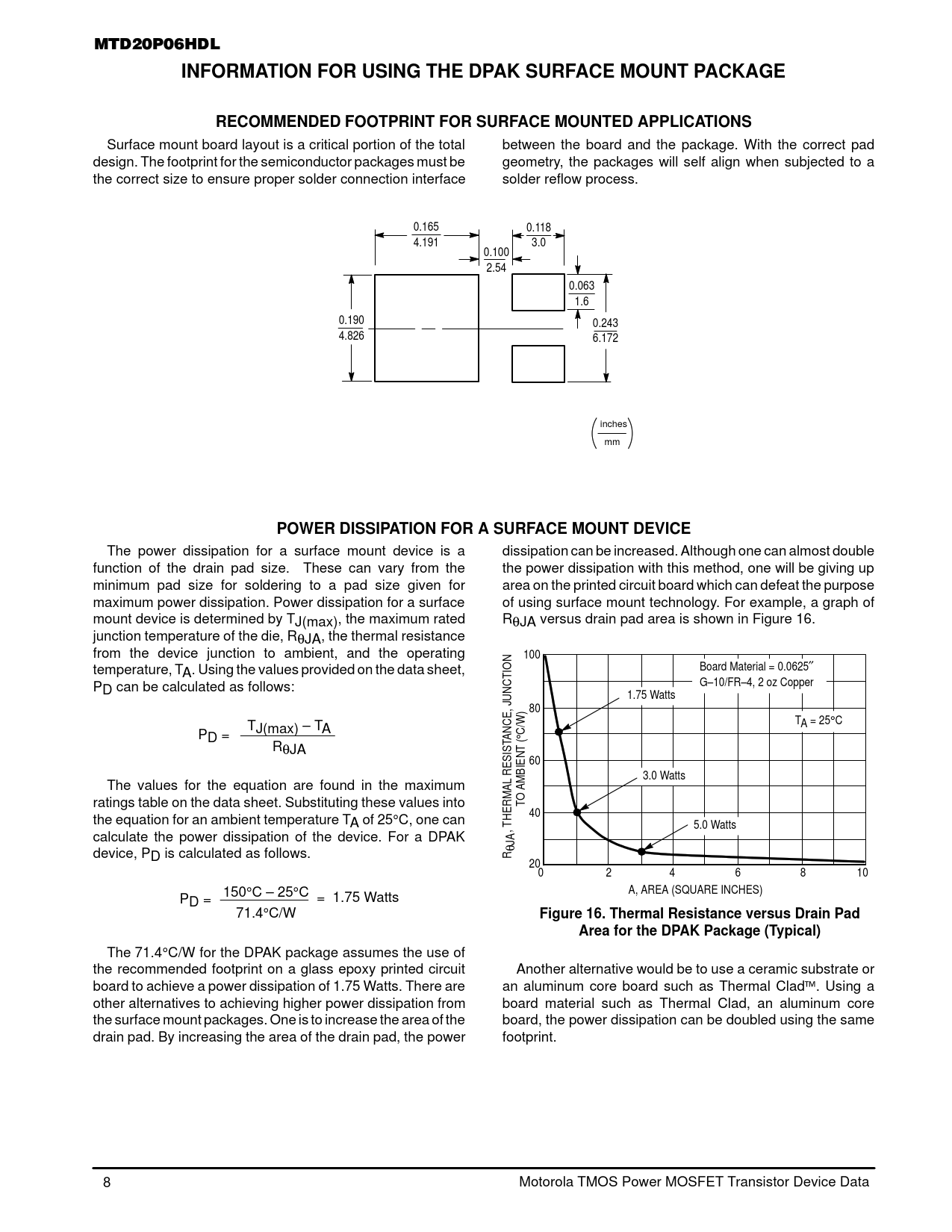 The 71.4°C/W for the DPAK package assumes the use of the recommended footprint on a glass epoxy printed circuit Another alternative would be to use a ceramic substrate or board to achieve a power dissipation of 1.75 Watts. There are an aluminum core board such as Thermal Clad. Using a other alternatives to achieving higher power dissipation from board material such as Thermal Clad, an aluminum core the surface mount packages. One is to increase the area of the board, the power dissipation can be doubled using the same drain pad. By increasing the area of the drain pad, the power footprint. 8 Motorola TMOS Power MOSFET Transistor Device Data