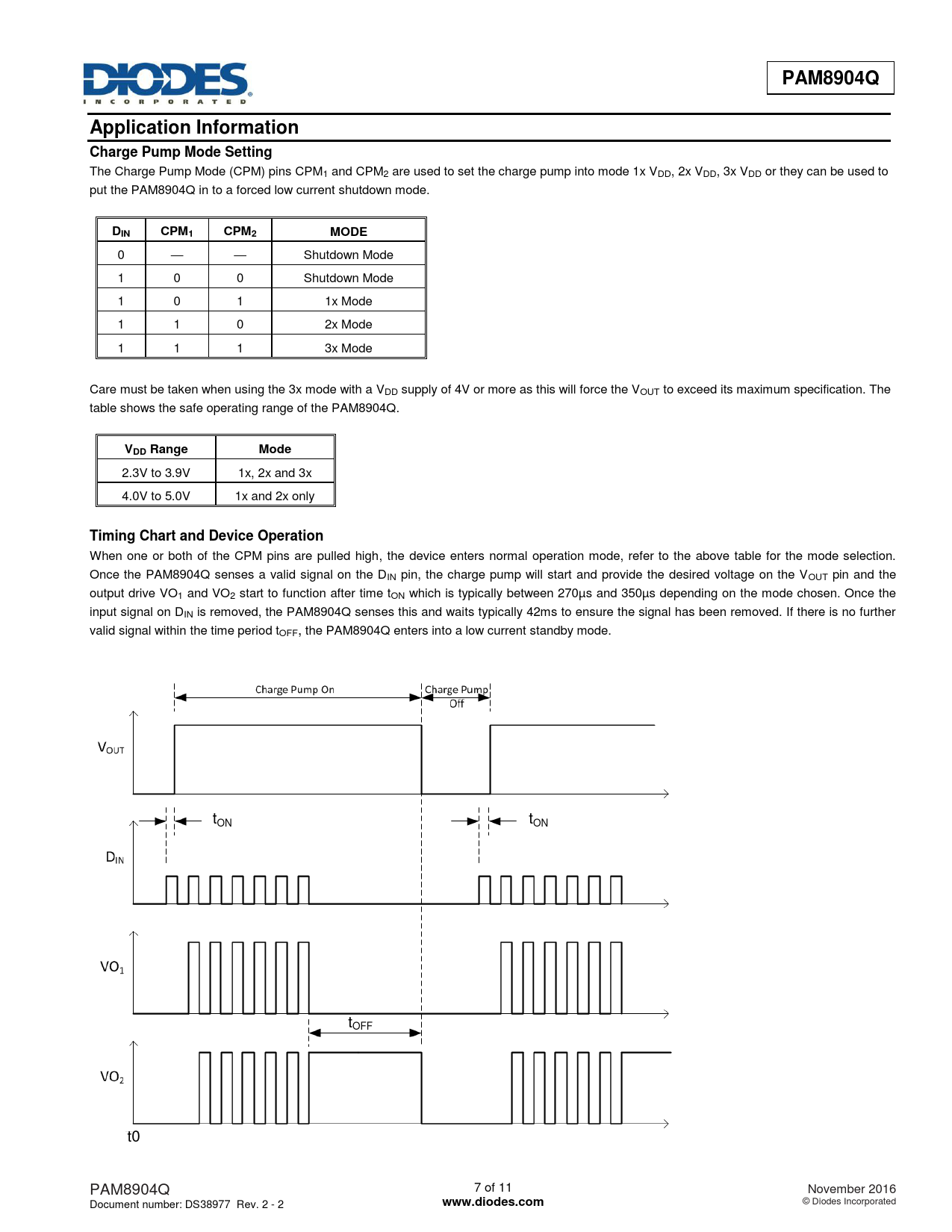 When one or both of the CPM pins are pulled high, the device enters normal operation mode, refer to the above table for the mode selection. Once the PAM8904Q senses a valid signal on the DIN pin, the charge pump will start and provide the desired voltage on the VOUT pin and the output drive VO1 and VO2 start to function after time tON which is typically between 270µs and 350µs depending on the mode chosen. Once the input signal on DIN is removed, the PAM8904Q senses this and waits typically 42ms to ensure the signal has been removed. If there is no further valid signal within the time period tOFF, the PAM8904Q enters into a low current standby mode. tON tON tOFF t0 PAM8904Q 7 of 11 November 2016 Document number: DS38977 Rev. 2 - 2