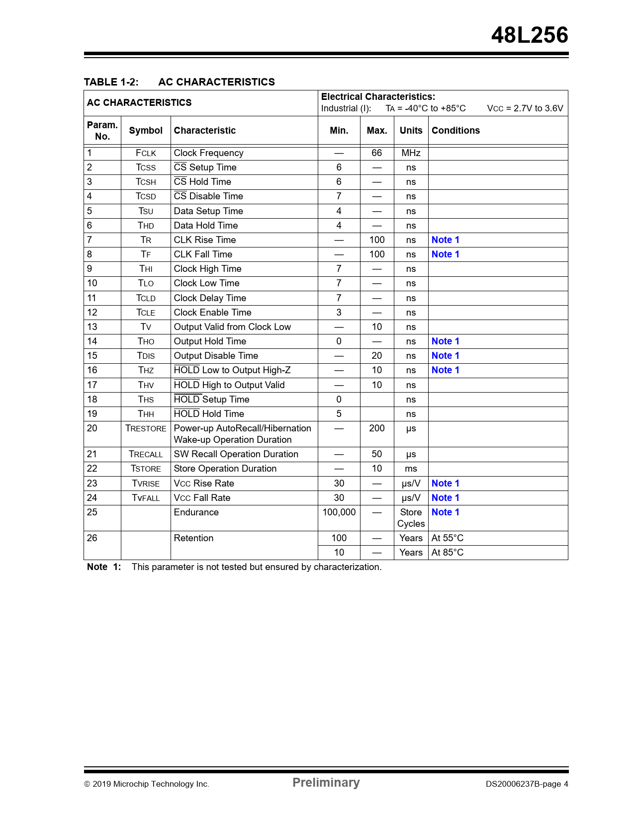 link to page 4 link to page 4 link to page 4 link to page 4 link to page 4 link to page 4 link to page 4 link to page 4 48L256TABLE 1-2:AC CHARACTERISTICSElectrical Characteristics:AC CHARACTERISTICS Industrial (I): TA = -40°C to +85°C VCC = 2.7V to 3.6V Param.SymbolCharacteristicMin.Max.Units ConditionsNo. 1 FCLK Clock Frequency — 66 MHz 2 TCSS CS Setup Time 6 — ns 3 TCSH CS Hold Time 6 — ns 4 TCSD CS Disable Time 7 — ns 5 TSU Data Setup Time 4 — ns 6 THD Data Hold Time 4 — ns 7 TR CLK Rise Time — 100 ns Note 1 8 TF CLK Fall Time — 100 ns Note 1 9 THI Clock High Time 7 — ns 10 TLO Clock Low Time 7 — ns 11 TCLD Clock Delay Time 7 — ns 12 TCLE Clock Enable Time 3 — ns 13 TV Output Valid from Clock Low — 10 ns 14 THO Output Hold Time 0 — ns Note 1 15 TDIS Output Disable Time — 20 ns Note 1 16 THZ HOLD Low to Output High-Z — 10 ns Note 1 17 THV HOLD High to Output Valid — 10 ns 18 THS HOLD Setup Time 0 ns 19 THH HOLD Hold Time 5 ns 20 TRESTORE Power-up AutoRecal /Hibernation — 200 μs Wake-up Operation Duration 21 TRECALL SW Recall Operation Duration — 50 μs 22 TSTORE Store Operation Duration — 10 ms 23 TVRISE VCC Rise Rate 30 — μs/V Note 1 24 TvFALL VCC Fall Rate 30 — μs/V Note 1 25 Endurance 100,000 — Store Note 1 Cycles 26 Retention 100 — Years At 55°C 10 — Years At 85°C Note 1: This parameter is not tested but ensured by characterization. 2019 Microchip Technology Inc. Preliminary DS20006237B-page 4 Document Outline Serial SRAM Features Hidden EEPROM Backup Features Other Features of the 48L256 Packages Package Types (not to scale) Pin Function Table General Description Block Diagram Normal Device Operation Vcc Power-Off Event 1.0 Electrical Characteristics Absolute Maximum Ratings† TABLE 1-1: DC Characteristics TABLE 1-2: AC Characteristics TABLE 1-3: AC Test Conditions 2.0 Pin Descriptions TABLE 2-1: Pin Function Table 2.1 Chip Select (CS) 2.2 Serial Output (SO) 2.3 Serial Input (SI) 2.4 Serial Clock (SCK) 2.5 Hold (HOLD) 3.0 Memory Organization 3.1 Data Array Organization 3.2 16-Bit Nonvolatile User Space 3.3 Device Registers 3.3.1 STATUS Register 4.0 Functional Description FIGURE 4-1: SPI Mode 0 and Mode 3 4.1 Interfacing the 48L256 on the SPI Bus 4.1.1 Selecting the Device 4.1.2 Sending Data to the Device 4.1.3 Receiving Data from the Device 4.2 Device Opcodes 4.2.1 Serial Opcode 4.2.2 Hold Function FIGURE 4-2: Hold Mode 5.0 Write Enable and Disable 5.1 Write Enable Instruction (WREN) FIGURE 5-1: WREN Waveform 5.2 Write Disable Instruction (WRDI) FIGURE 5-2: WRDI Waveform 6.0 STATUS Register 6.1 Block Write-Protect Bits TABLE 6-2: Block Write-Protect Bits 6.2 Write Enable Latch 6.3 Ready/Busy Status Latch 6.4 Read STATUS Register (RDSR) FIGURE 6-1: RDSR Waveform 6.5 Write STATUS Register (WRSR) FIGURE 6-2: WRSR Waveform 7.0 Read Operations 7.1 Reading from the SRAM (READ) FIGURE 7-1: Read SRAM (READ) Waveform 7.2 Read Last Successfully Written Address (RDLSWA) FIGURE 7-2: Read Last Successfully Written Address Waveform 8.0 Write Commands 8.1 Write Instruction Sequences 8.1.1 SRAM Byte Write FIGURE 8-1: SRAM Byte Write Waveform 8.1.2 Continuous Write FIGURE 8-2: Continuous SRAM Write Waveform 9.0 Nonvolatile User Space Access 9.1 Write Nonvolatile User Space (WRNUR) 9.2 Read Nonvolatile User Space (RDNUR) 10.0 Secure Operations 10.1 Secure Write 10.2 Secure Read TABLE 10-1: Secure Write Bits 11.0 Store/Recall Operations 11.1 Automatic Store on Any Power Disruption 11.2 Automatic Recall to SRAM 11.3 Software Store Command FIGURE 11-1: Software Store 11.4 Software Recall Command FIGURE 11-2: Software Recall 11.5 Polling Routine FIGURE 11-3: Polling Flow 12.0 Hibernation FIGURE 12-1: Hibernate Waveform 13.0 Trip Voltage 13.1 Power Switchover 14.0 Packaging Information 14.1 Package Marking Information Appendix A: Revision History Product ID System Trademarks Worldwide Sales and Service