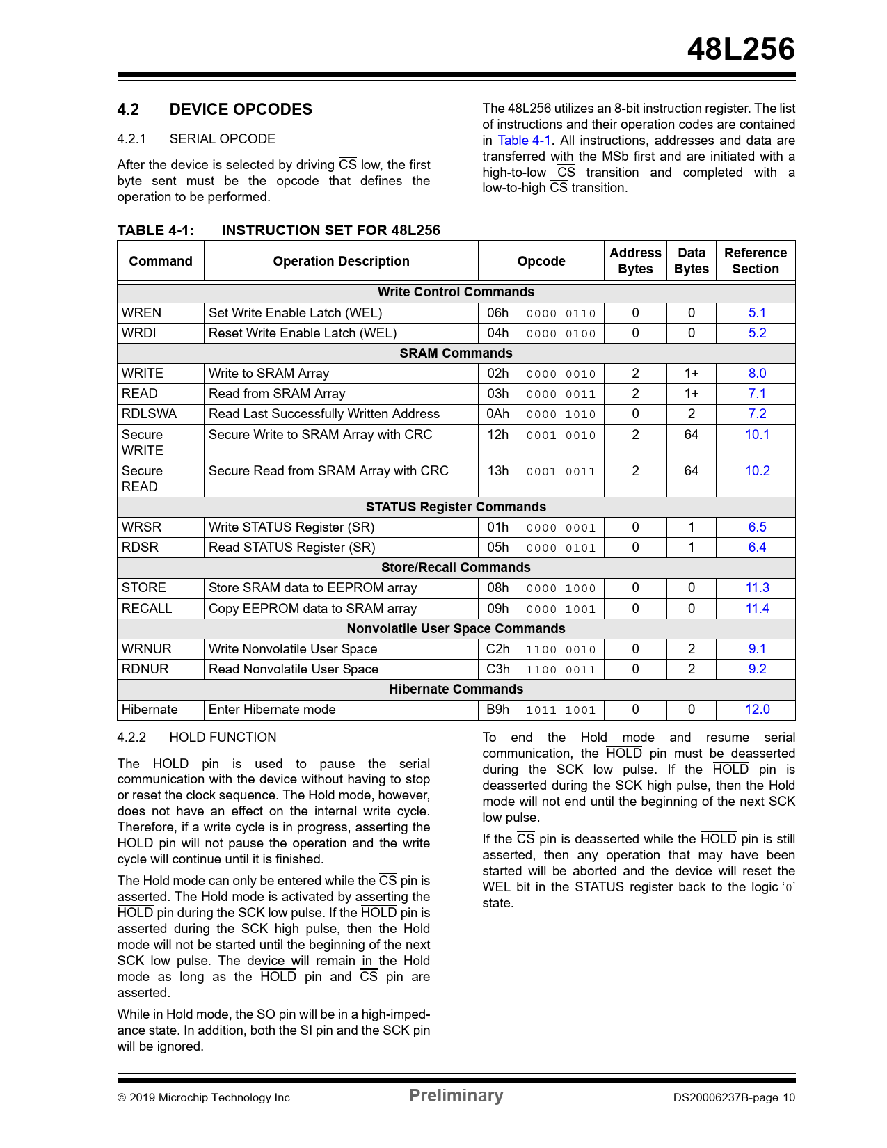 link to page 10 link to page 12 link to page 12 link to page 17 link to page 16 link to page 20 link to page 20 link to page 15 link to page 14 link to page 22 link to page 23 link to page 19 link to page 19 link to page 27 link to page 16 48L2564.2DEVICE OPCODES The 48L256 utilizes an 8-bit instruction register. The list of instructions and their operation codes are contained 4.2.1 SERIAL OPCODE in Table 4-1. All instructions, addresses and data are transferred with the MSb first and are initiated with a After the device is selected by driving CS low, the first high-to-low CS transition and completed with a byte sent must be the opcode that defines the low-to-high CS transition. operation to be performed. TABLE 4-1:INSTRUCTION SET FOR 48L256Address DataReferenceCommandOperation DescriptionOpcodeBytesBytesSectionWrite Control Commands WREN Set Write Enable Latch (WEL) 06h 0000 0110 0 0 5.1 WRDI Reset Write Enable Latch (WEL) 04h 0000 0100 0 0 5.2 SRAM Commands WRITE Write to SRAM Array 02h 0000 0010 2 1+ 8.0 READ Read from SRAM Array 03h 0000 0011 2 1+ 7.1 RDLSWA Read Last Successfully Written Address 0Ah 0000 1010 0 2 7.2 Secure Secure Write to SRAM Array with CRC 12h 0001 0010 2 64 10.1 WRITE Secure Secure Read from SRAM Array with CRC 13h 0001 0011 2 64 10.2 READ STATUS Register Commands WRSR Write STATUS Register (SR) 01h 0000 0001 0 1 6.5 RDSR Read STATUS Register (SR) 05h 0000 0101 0 1 6.4 Store/Recall Commands STORE Store SRAM data to EEPROM array 08h 0000 1000 0 0 11.3 RECALL Copy EEPROM data to SRAM array 09h 0000 1001 0 0 11.4 Nonvolatile User Space Commands WRNUR Write Nonvolatile User Space C2h 1100 0010 0 2 9.1 RDNUR Read Nonvolatile User Space C3h 1100 0011 0 2 9.2 Hibernate Commands Hibernate Enter Hibernate mode B9h 1011 1001 0 0 12.0 4.2.2 HOLD FUNCTION To end the Hold mode and resume serial communication, the HOLD pin must be deasserted The HOLD pin is used to pause the serial during the SCK low pulse. If the HOLD pin is communication with the device without having to stop deasserted during the SCK high pulse, then the Hold or reset the clock sequence. The Hold mode, however, mode will not end until the beginning of the next SCK does not have an effect on the internal write cycle. low pulse. Therefore, if a write cycle is in progress, asserting the HOLD pin will not pause the operation and the write If the CS pin is deasserted while the HOLD pin is still cycle will continue until it is finished. asserted, then any operation that may have been started will be aborted and the device will reset the The Hold mode can only be entered while the CS pin is WEL bit in the STATUS register back to the logic ‘0’ asserted. The Hold mode is activated by asserting the state. HOLD pin during the SCK low pulse. If the HOLD pin is asserted during the SCK high pulse, then the Hold mode wil not be started until the beginning of the next SCK low pulse. The device wil remain in the Hold mode as long as the HOLD pin and CS pin are asserted. While in Hold mode, the SO pin will be in a high-imped- ance state. In addition, both the SI pin and the SCK pin will be ignored. 2019 Microchip Technology Inc. Preliminary DS20006237B-page 10 Document Outline Serial SRAM Features Hidden EEPROM Backup Features Other Features of the 48L256 Packages Package Types (not to scale) Pin Function Table General Description Block Diagram Normal Device Operation Vcc Power-Off Event 1.0 Electrical Characteristics Absolute Maximum Ratings† TABLE 1-1: DC Characteristics TABLE 1-2: AC Characteristics TABLE 1-3: AC Test Conditions 2.0 Pin Descriptions TABLE 2-1: Pin Function Table 2.1 Chip Select (CS) 2.2 Serial Output (SO) 2.3 Serial Input (SI) 2.4 Serial Clock (SCK) 2.5 Hold (HOLD) 3.0 Memory Organization 3.1 Data Array Organization 3.2 16-Bit Nonvolatile User Space 3.3 Device Registers 3.3.1 STATUS Register 4.0 Functional Description FIGURE 4-1: SPI Mode 0 and Mode 3 4.1 Interfacing the 48L256 on the SPI Bus 4.1.1 Selecting the Device 4.1.2 Sending Data to the Device 4.1.3 Receiving Data from the Device 4.2 Device Opcodes 4.2.1 Serial Opcode 4.2.2 Hold Function FIGURE 4-2: Hold Mode 5.0 Write Enable and Disable 5.1 Write Enable Instruction (WREN) FIGURE 5-1: WREN Waveform 5.2 Write Disable Instruction (WRDI) FIGURE 5-2: WRDI Waveform 6.0 STATUS Register 6.1 Block Write-Protect Bits TABLE 6-2: Block Write-Protect Bits 6.2 Write Enable Latch 6.3 Ready/Busy Status Latch 6.4 Read STATUS Register (RDSR) FIGURE 6-1: RDSR Waveform 6.5 Write STATUS Register (WRSR) FIGURE 6-2: WRSR Waveform 7.0 Read Operations 7.1 Reading from the SRAM (READ) FIGURE 7-1: Read SRAM (READ) Waveform 7.2 Read Last Successfully Written Address (RDLSWA) FIGURE 7-2: Read Last Successfully Written Address Waveform 8.0 Write Commands 8.1 Write Instruction Sequences 8.1.1 SRAM Byte Write FIGURE 8-1: SRAM Byte Write Waveform 8.1.2 Continuous Write FIGURE 8-2: Continuous SRAM Write Waveform 9.0 Nonvolatile User Space Access 9.1 Write Nonvolatile User Space (WRNUR) 9.2 Read Nonvolatile User Space (RDNUR) 10.0 Secure Operations 10.1 Secure Write 10.2 Secure Read TABLE 10-1: Secure Write Bits 11.0 Store/Recall Operations 11.1 Automatic Store on Any Power Disruption 11.2 Automatic Recall to SRAM 11.3 Software Store Command FIGURE 11-1: Software Store 11.4 Software Recall Command FIGURE 11-2: Software Recall 11.5 Polling Routine FIGURE 11-3: Polling Flow 12.0 Hibernation FIGURE 12-1: Hibernate Waveform 13.0 Trip Voltage 13.1 Power Switchover 14.0 Packaging Information 14.1 Package Marking Information Appendix A: Revision History Product ID System Trademarks Worldwide Sales and Service