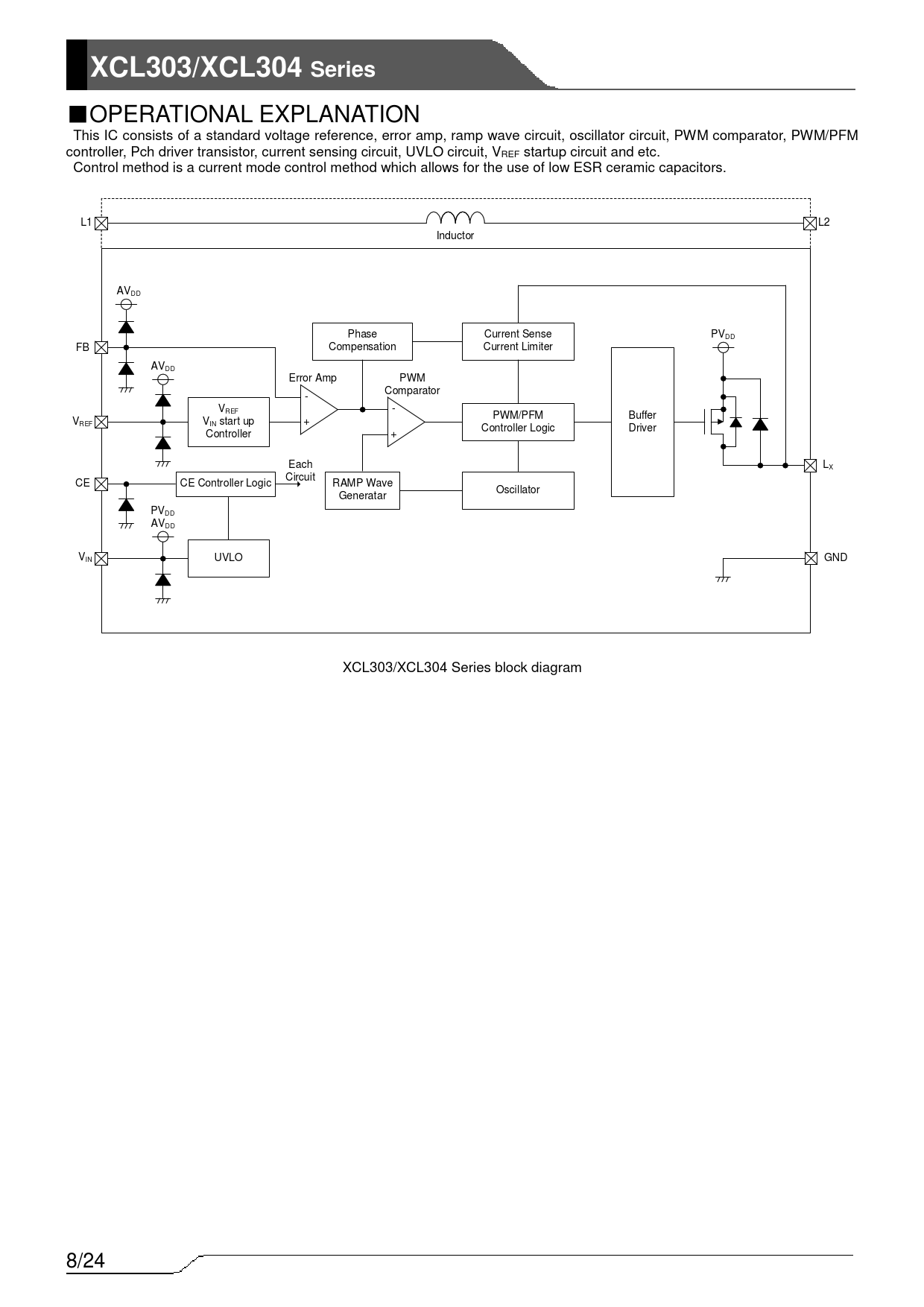 XCL303/XCL304 Series ■OPERATIONAL EXPLANATION This IC consists of a standard voltage reference, error amp, ramp wave circuit, oscillator circuit, PWM comparator, PWM/PFM controller, Pch driver transistor, current sensing circuit, UVLO circuit, VREF startup circuit and etc. Control method is a current mode control method which allows for the use of low ESR ceramic capacitors. L1 L2 Inductor AVDD Phase Current Sense PVDD FB Compensation Current Limiter AVDD Error Amp PWM Comparator - VREF - PWM/PFM Buffer VREF VIN start up + Controller Logic Driver Controller + Each L X Circuit CE CE Controller Logic RAMP Wave Oscillator Generatar PVDD AVDD VIN UVLO GND XCL303/XCL304 Series block diagram 8/24