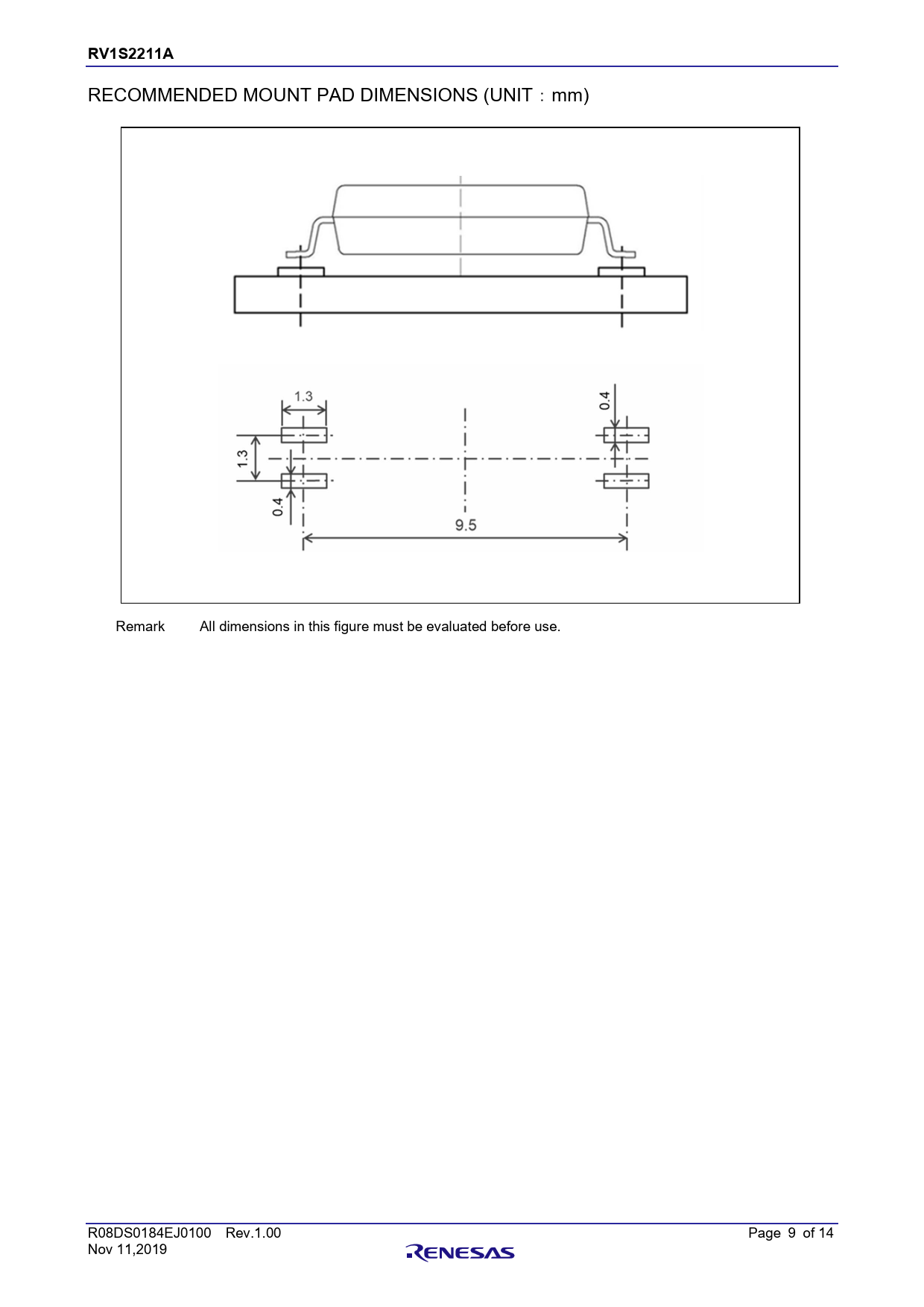 Model Line for this Datasheet Text Version of Document RV1S2211A 章題 RECOMMENDED MOUNT PAD DIMENSIONS (UNIT:mm) Remark All dimensions in this figure must be evaluated before use. R08DS0184EJ0100 Rev.1.00 Page 9 of 14 Nov 11,2019