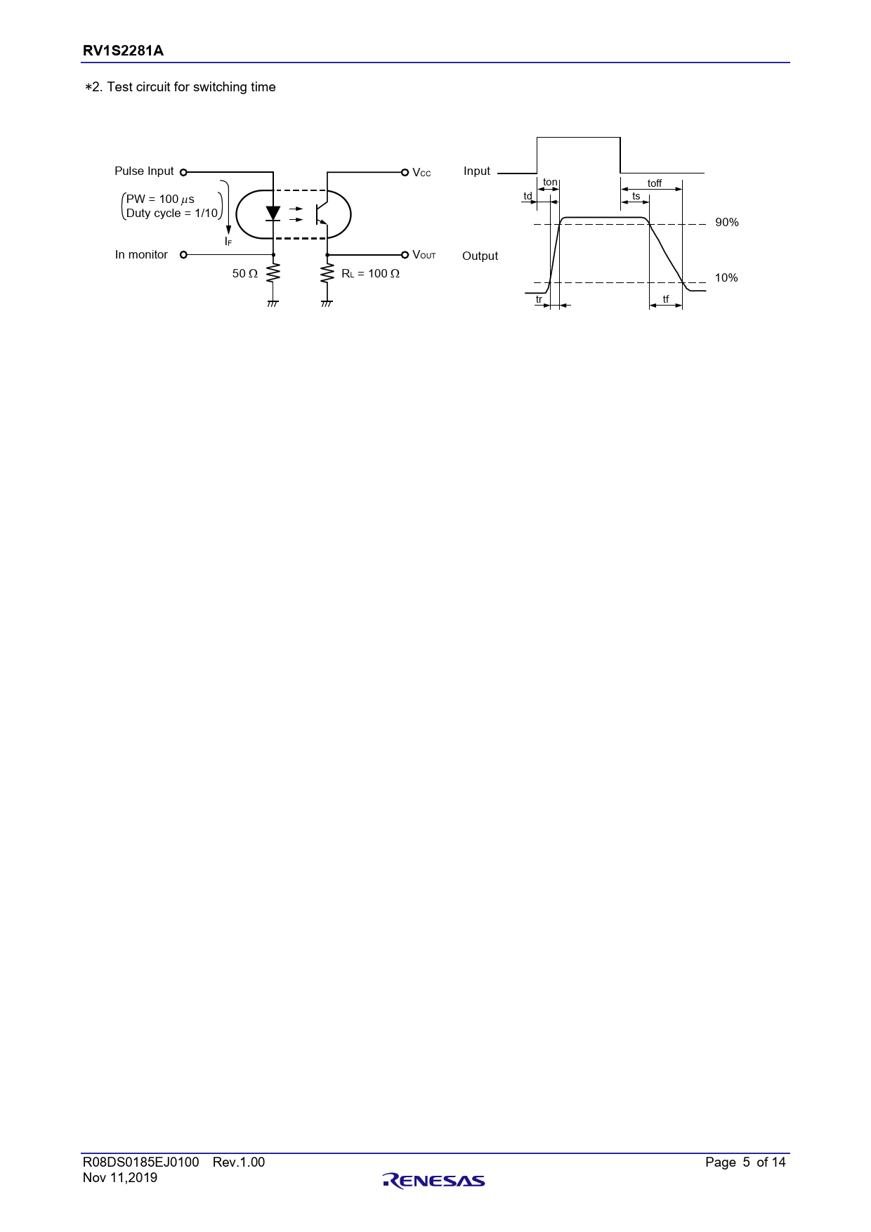 RV1S2281A 章題 *2. Test circuit for switching time Pulse Input VCC Input ton toff PW = 100 s td ts Duty cycle = 1/10 90% IF In monitor VOUT Output 50 RL = 100 10% tr tf R08DS0185EJ0100 Rev.1.00 Page 5 of 14 Nov 11,2019