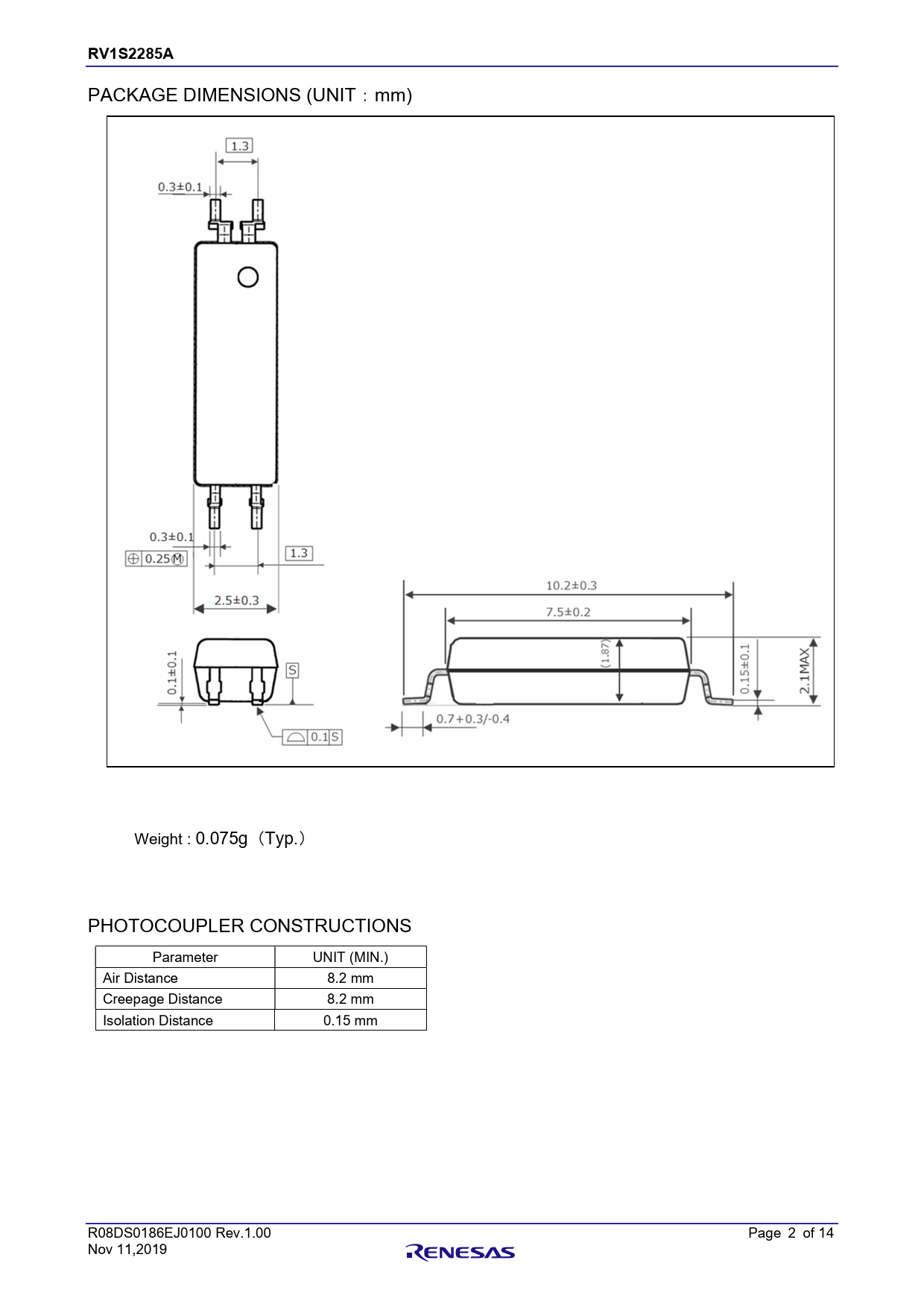 RV1S2285A 章題 PACKAGE DIMENSIONS (UNIT:mm) Weight : 0.075g(Typ.) PHOTOCOUPLER CONSTRUCTIONS Parameter UNIT (MIN.) Air Distance 8.2 mm Creepage Distance 8.2 mm Isolation Distance 0.15 mm R08DS0186EJ0100 Rev.1.00 Page 2 of 14 Nov 11,2019