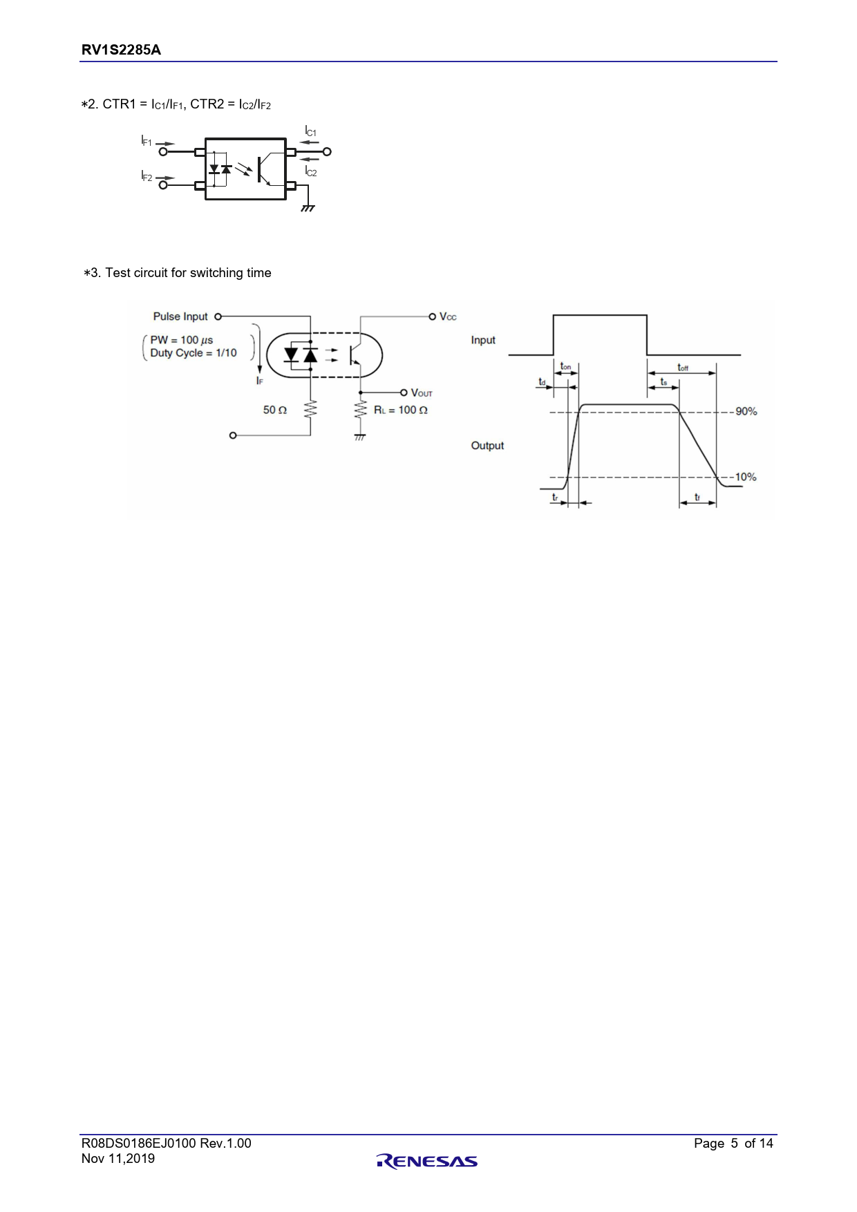RV1S2285A 章題 *2. CTR1 = IC1/IF1, CTR2 = IC2/IF2 IC1 IF1 I C2 IF2 *3. Test circuit for switching time R08DS0186EJ0100 Rev.1.00 Page 5 of 14 Nov 11,2019