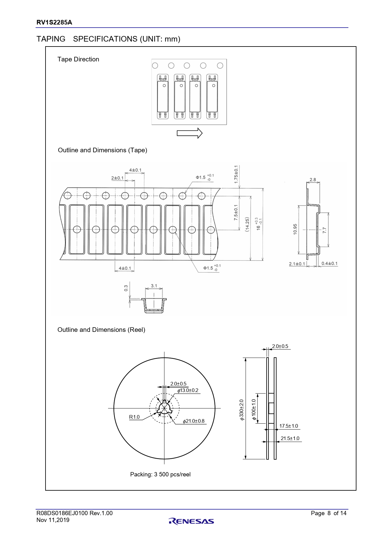 RV1S2285A. 章題. TAPING. SPECIFICATIONS. (UNIT:. mm). Tape. Direction. Outline. and. Dimensions. (Tape). Outline. and. Dimensions. (Reel). 2.0±0.5. 2.0±0.5