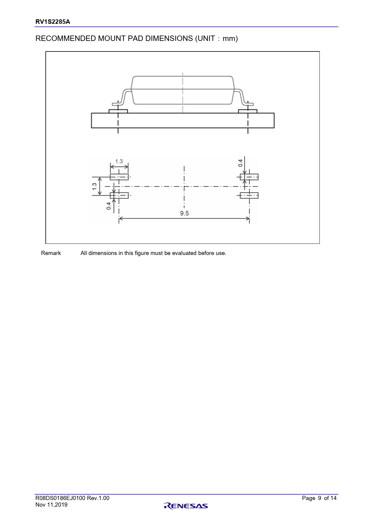 Model Line for this Datasheet Text Version of Document RV1S2285A 章題 RECOMMENDED MOUNT PAD DIMENSIONS (UNIT:mm) Remark All dimensions in this figure must be evaluated before use. R08DS0186EJ0100 Rev.1.00 Page 9 of 14 Nov 11,2019
