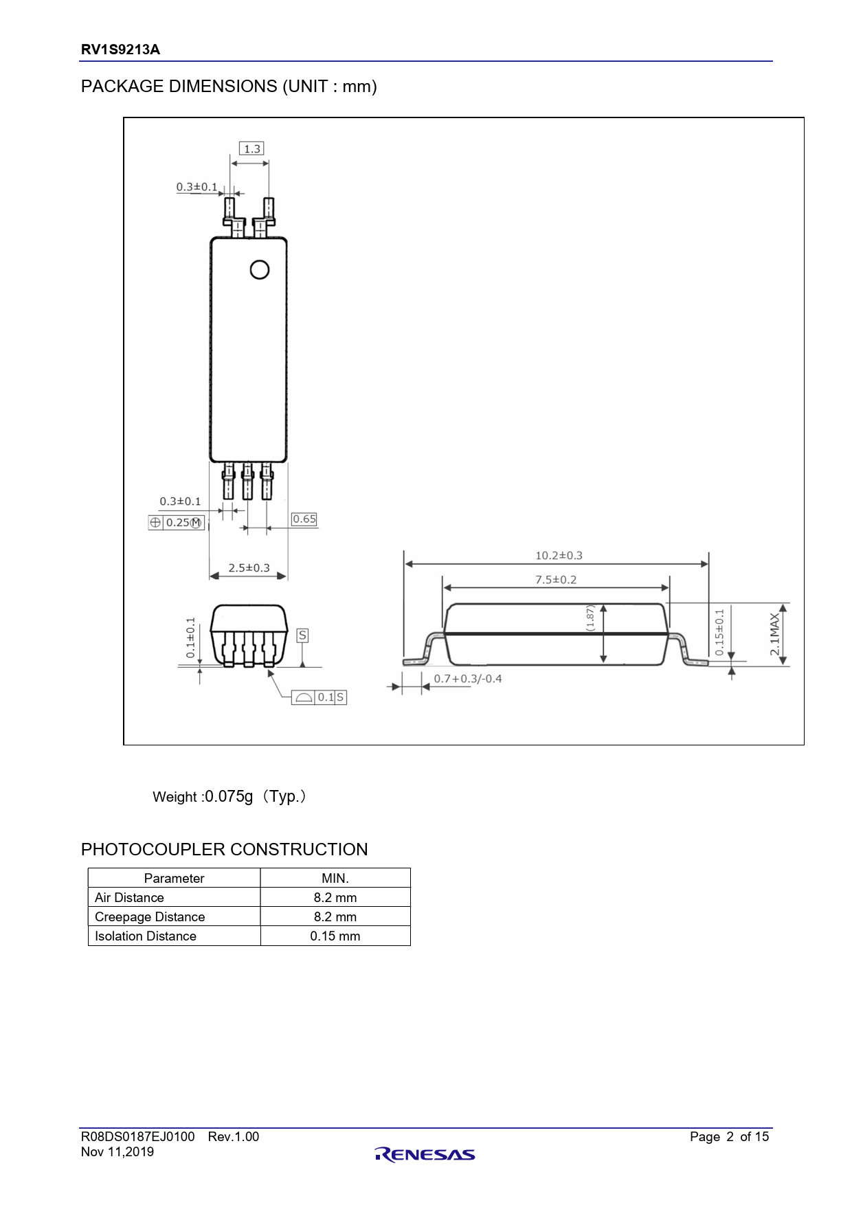 RV1S9213A 章題 PACKAGE DIMENSIONS (UNIT : mm) Weight :0.075g(Typ.) PHOTOCOUPLER CONSTRUCTION Parameter MIN. Air Distance 8.2 mm Creepage Distance 8.2 mm Isolation Distance 0.15 mm R08DS0187EJ0100 Rev.1.00 Page 2 of 15 Nov 11,2019