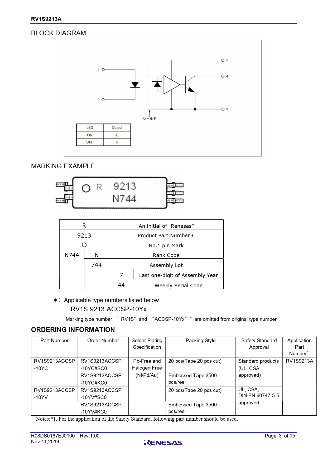 RV1S9213A. 章題. BLOCK. DIAGRAM. MARKING. EXAMPLE. R. An. initial. of. “Renesas”. 9213. Product. Part. Number*. ○. No.1. pin. Mark. N744. N. Rank. Code. 744. Assembly. Lot