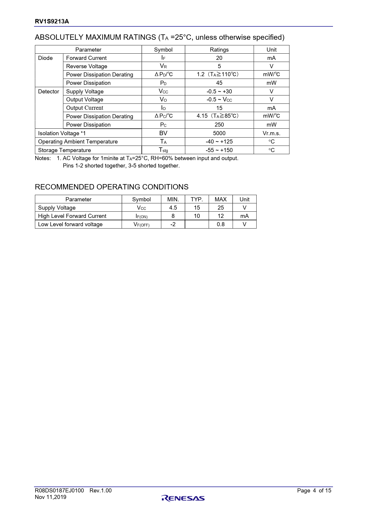 RV1S9213A 章題 ABSOLUTELY MAXIMUM RATINGS (TA =25°C, unless otherwise specified) Parameter Symbol Ratings Unit Diode Forward Current IF 20 mA Reverse Voltage VR 5 V Power Dissipation Derating ΔPD/℃ 1.2(TA≧110℃) mW/℃ Power Dissipation PD 45 mW Detector Supply Voltage VCC -0.5 ~ +30 V Output Voltage VO -0.5 ~ VCC V Output Current IO 15 mA Power Dissipation Derating ΔPC/℃ 4.15(TA≧85℃) mW/℃ Power Dissipation PC 250 mW Isolation Voltage *1 BV 5000 Vr.m.s. Operating Ambient Temperature TA -40 ~ +125 C Storage Temperature Tstg -55 ~ +150 C Notes: 1. AC Voltage for 1minite at TA=25°C, RH=60% between input and output. Pins 1-2 shorted together, 3-5 shorted together. RECOMMENDED OPERATING CONDITIONS Parameter Symbol MIN. TYP. MAX Unit Supply Voltage VCC 4.5 15 25 V High Level Forward Current IF(ON) 8 10 12 mA Low Level forward voltage VF(OFF) -2 0.8 V R08DS0187EJ0100 Rev.1.00 Page 4 of 15 Nov 11,2019