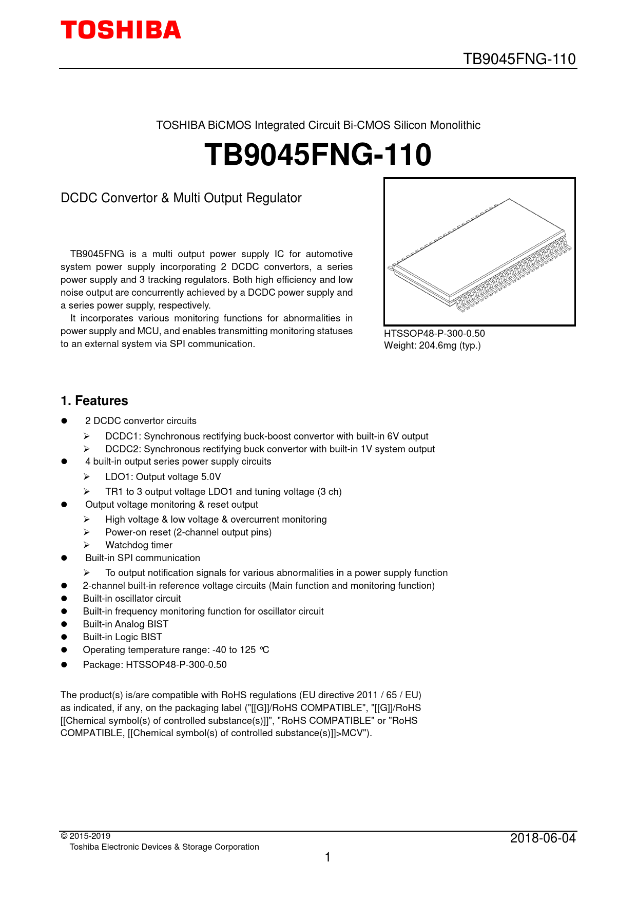 2 DCDC convertor circuits DCDC1: Synchronous rectifying buck-boost convertor with built-in 6V output DCDC2: Synchronous rectifying buck convertor with built-in 1V system output 4 built-in output series power supply circuits LDO1: Output voltage 5.0V TR1 to 3 output voltage LDO1 and tuning voltage (3 ch) Output voltage monitoring & reset output High voltage & low voltage & overcurrent monitoring Power-on reset (2-channel output pins) Watchdog timer Built-in SPI communication To output notification signals for various abnormalities in a power supply function 2-channel built-in reference voltage circuits (Main function and monitoring function) Built-in oscillator circuit Built-in frequency monitoring function for oscillator circuit Built-in Analog BIST Built-in Logic BIST Operating temperature range: -40 to 125 °C Package: HTSSOP48-P-300-0.50 The product(s) is/are compatible with RoHS regulations (EU directive 2011 / 65 / EU) as indicated, if any, on the packaging label ("[[G]]/RoHS COMPATIBLE", "[[G]]/RoHS [[Chemical symbol(s) of controlled substance(s)]]", "RoHS COMPATIBLE" or "RoHS COMPATIBLE, [[Chemical symbol(s) of controlled substance(s)]]>MCV"). © 2015-2019 2018-06-04 Toshiba Electronic Devices & Storage Corporation 1