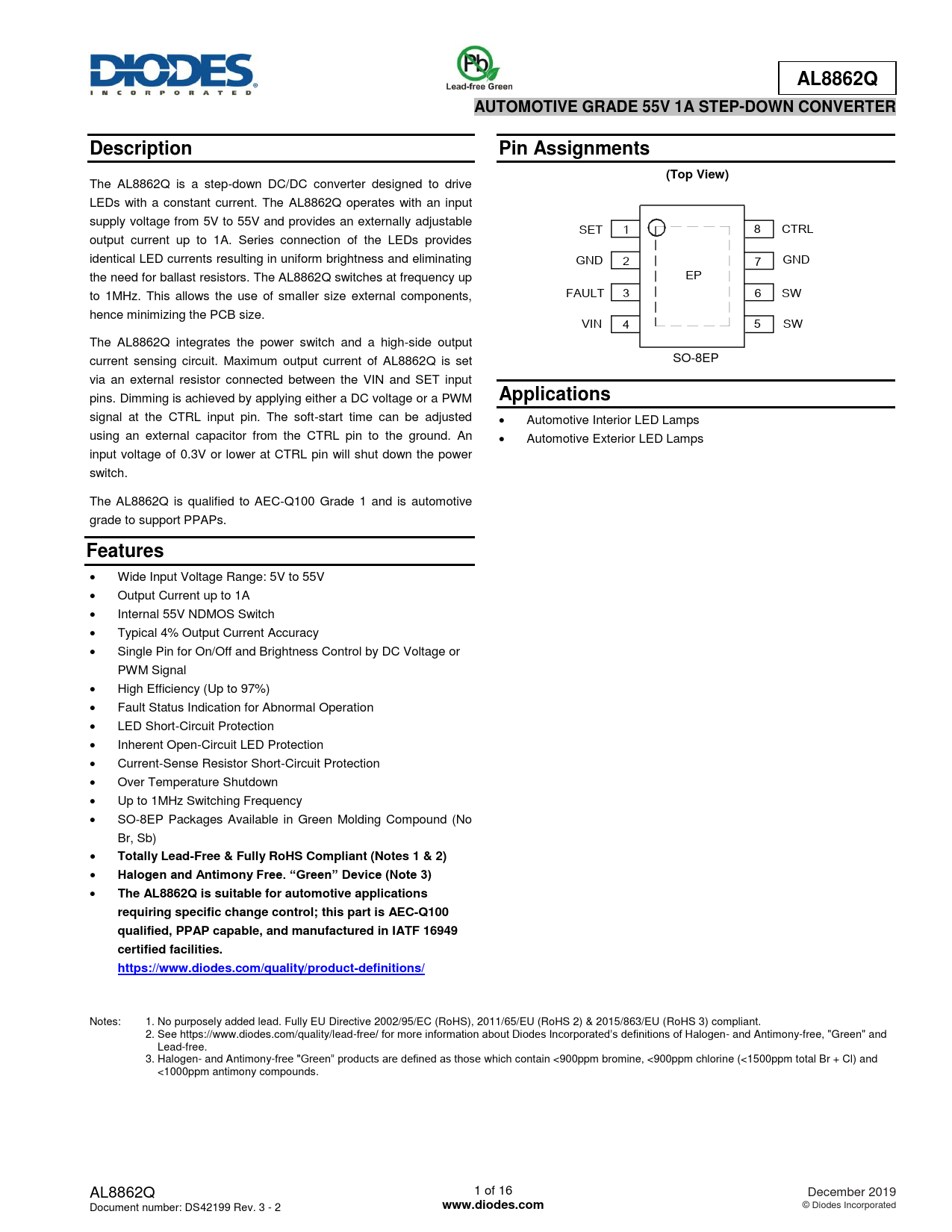 Totally Lead-Free & Fully RoHS Compliant (Notes 1 & 2) Halogen and Antimony Free. “Green” Device (Note 3) The AL8862Q is suitable for automotive applications requiring specific change control; this part is AEC-Q100 qualified, PPAP capable, and manufactured in IATF 16949 certified facilities. https://www.diodes.com/quality/product-definitions/