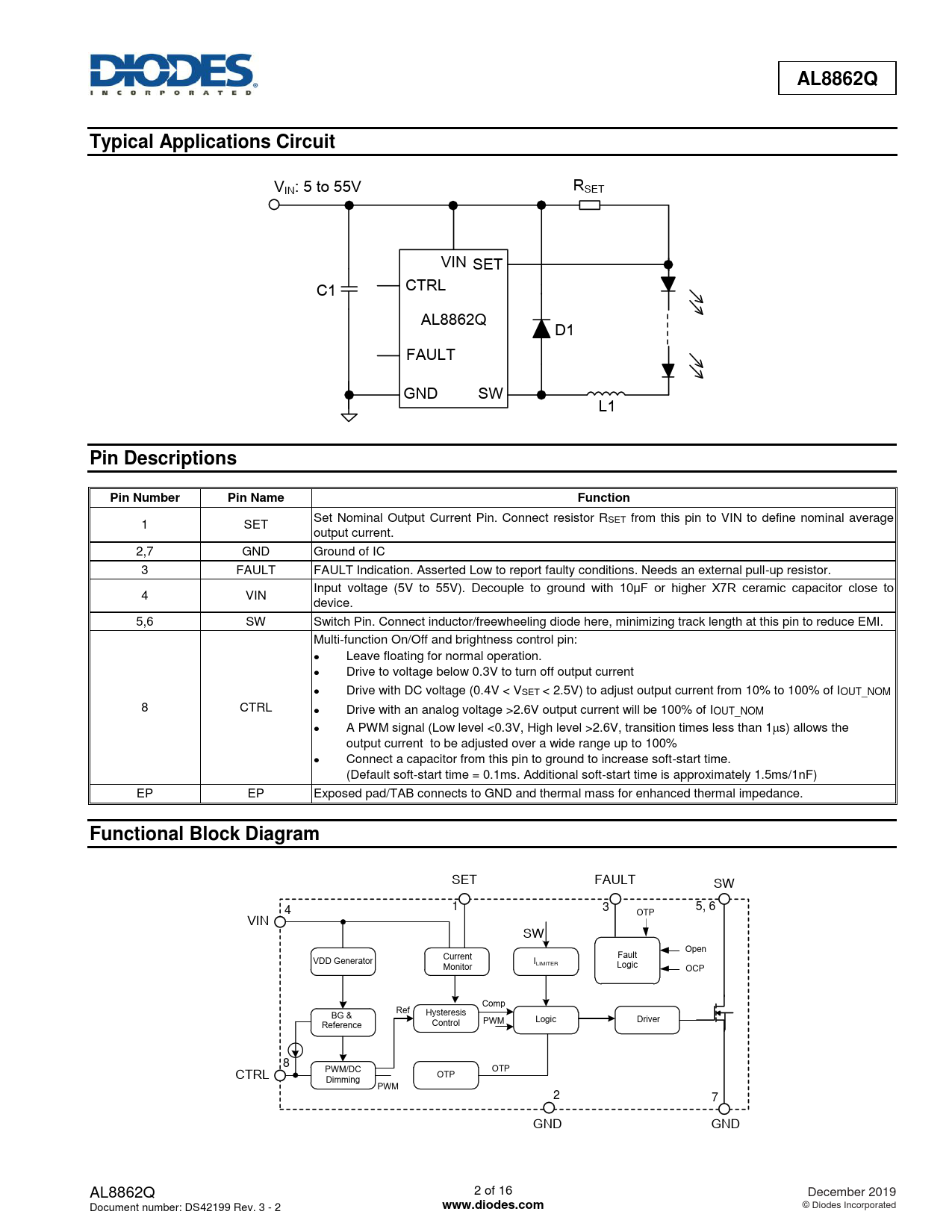 AL8862Q. Typical Applications Circuit. Pin Descriptions. Pin Number. Pin Name. Function. Functional Block Diagram. www.diodes.com