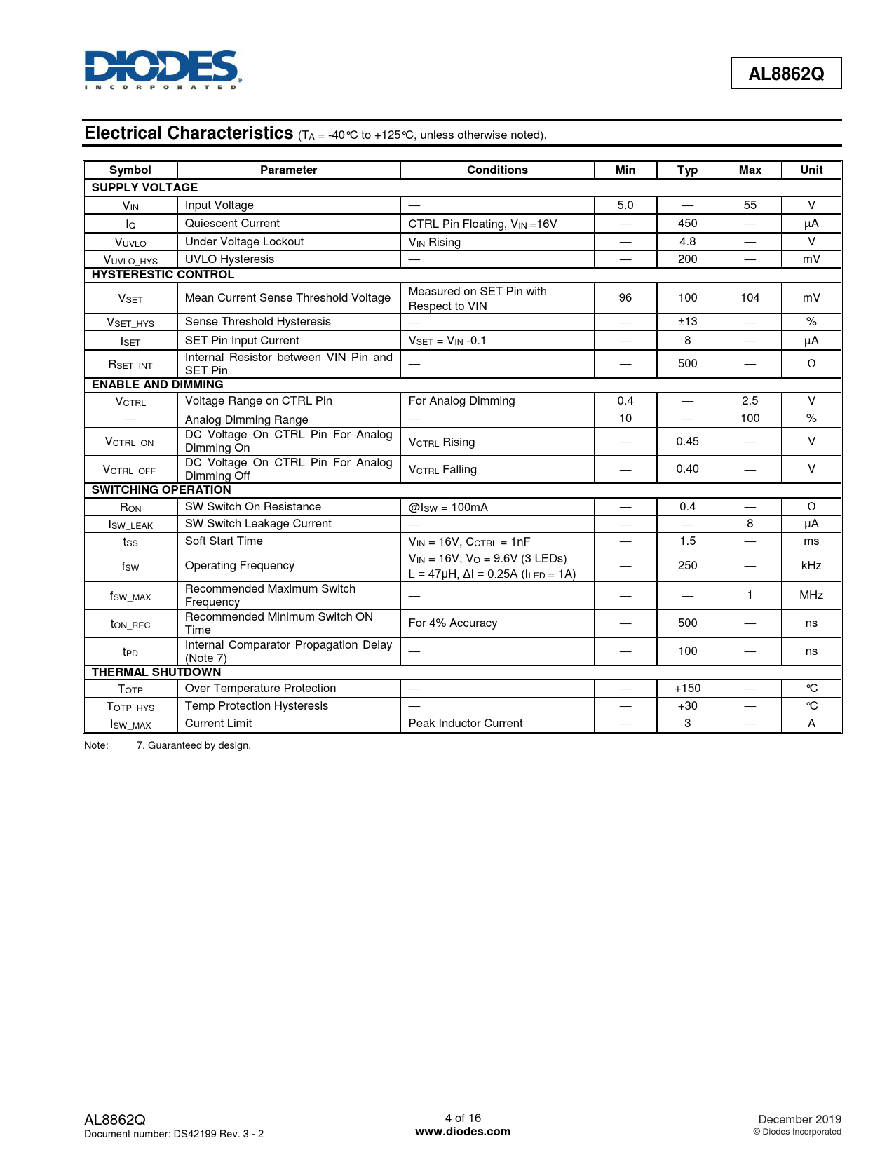 AL8862Q. Electrical Characteristics. Symbol. Parameter. Conditions. Min. Typ. Max. Unit. SUPPLY VOLTAGE. HYSTERESTIC CONTROL