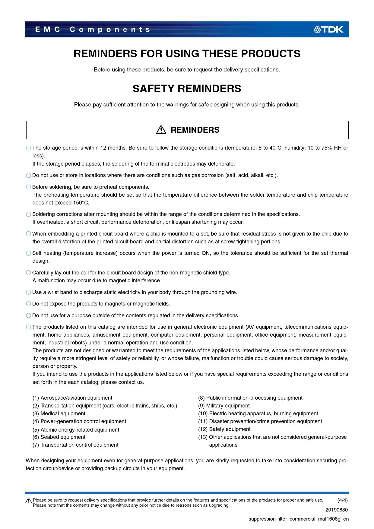 The storage period is within 12 months. Be sure to follow the storage conditions (temperature: 5 to 40°C, humidity: 10 to 75% RH or less). If the storage period elapses, the soldering of the terminal electrodes may deteriorate. Do not use or store in locations where there are conditions such as gas corrosion (salt, acid, alkali, etc.). Before soldering, be sure to preheat components. The preheating temperature should be set so that the temperature difference between the solder temperature and chip temperature does not exceed 150°C. Soldering corrections after mounting should be within the range of the conditions determined in the specifications. If overheated, a short circuit, performance deterioration, or lifespan shortening may occur. When embedding a printed circuit board where a chip is mounted to a set, be sure that residual stress is not given to the chip due to the overall distortion of the printed circuit board and partial distortion such as at screw tightening portions. Self heating (temperature increase) occurs when the power is turned ON, so the tolerance should be sufficient for the set thermal design. Carefully lay out the coil for the circuit board design of the non-magnetic shield type. A malfunction may occur due to magnetic interference. Use a wrist band to discharge static electricity in your body through the grounding wire. Do not expose the products to magnets or magnetic fields. Do not use for a purpose outside of the contents regulated in the delivery specifications. The products listed on this catalog are intended for use in general electronic equipment (AV equipment, telecommunications equip- ment, home appliances, amusement equipment, computer equipment, personal equipment, office equipment, measurement equip- ment, industrial robots) under a normal operation and use condition. The products are not designed or warranted to meet the requirements of the applications listed below, whose performance and/or qual- ity require a more stringent level of safety or reliability, or whose failure, malfunction or trouble could cause serious damage to society, person or property. If you intend to use the products in the applications listed below or if you have special requirements exceeding the range or conditions set forth in the each catalog, please contact us. (1) Aerospace/aviation equipment (8) Public information-processing equipment (2) Transportation equipment (cars, electric trains, ships, etc.) (9) Military equipment (3) Medical equipment (10) Electric heating apparatus, burning equipment (4) Power-generation control equipment (11) Disaster prevention/crime prevention equipment (5) Atomic energy-related equipment   (12) Safety equipment (6) Seabed equipment (13) Other applications that are not considered general-purpose (7) Transportation control equipment applications When designing your equipment even for general-purpose applications, you are kindly requested to take into consideration securing pro- tection circuit/device or providing backup circuits in your equipment. Please be sure to request delivery specifications that provide further details on the features and specifications of the products for proper and safe use. (4/4) Please note that the contents may change without any prior notice due to reasons such as upgrading. 20190830 suppression-filter_commercial_maf1608g_en.fm