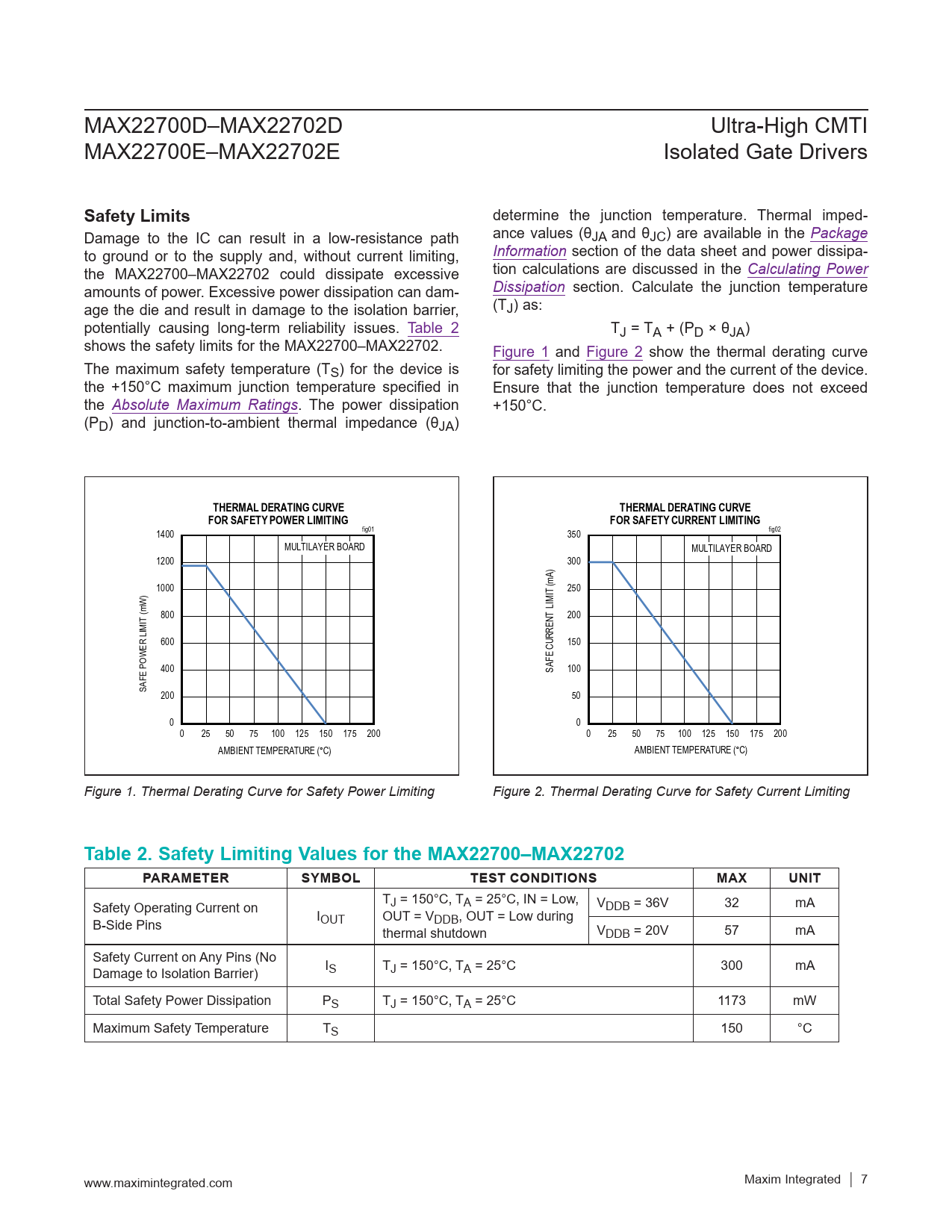 link to page 7 link to page 2 link to page 2 link to page 2 link to page 19 link to page 19 link to page 7 link to page 7 MAX22700D–MAX22702D Ultra-High CMTI MAX22700E–MAX22702E Isolated Gate Drivers Safety Limits determine the junction temperature. Thermal imped- Damage to the IC can result in a low-resistance path ance values (θJA and θJC) are available in the Package to ground or to the supply and, without current limiting, Information section of the data sheet and power dissipa- the MAX22700–MAX22702 could dissipate excessive tion calculations are discussed in the Calculating Power amounts of power. Excessive power dissipation can dam- Dissipation section. Calculate the junction temperature age the die and result in damage to the isolation barrier, (TJ) as: potentially causing long-term reliability issues. Table 2 TJ = TA + (PD × θJA) shows the safety limits for the MAX22700–MAX22702. Figure 1 and Figure 2 show the thermal derating curve The maximum safety temperature (TS) for the device is for safety limiting the power and the current of the device. the +150°C maximum junction temperature specified in Ensure that the junction temperature does not exceed the Absolute Maximum Ratings. The power dissipation +150°C. (PD) and junction-to-ambient thermal impedance (θJA) THERMAL DERATING CURVETHERMAL DERATING CURVEFOR SAFETY POWER LIMITINGFOR SAFETY CURRENT LIMITING 1400 fig01 350 fig02 MULTILAYER BOARD MULTILAYER BOARD 1200 300 A) 1000 ) 250 IT (m W 800 IT (m 200 RENT LIM 600 ER LIM 150 400 SAFE CUR 100 SAFE POW 200 50 0 0 0 25 50 75 100 125 150 175 200 0 25 50 75 100 125 150 175 200 AMBIENT TEMPERATURE (°C) AMBIENT TEMPERATURE (°C) Figure 1. Thermal Derating Curve for Safety Power Limiting Figure 2. Thermal Derating Curve for Safety Current Limiting Table 2. Safety Limiting Values for the MAX22700–MAX22702PARAMETERSYMBOLTEST CONDITIONSMAXUNIT Safety Operating Current on TJ = 150°C, TA = 25°C, IN = Low, VDDB = 36V 32 mA B-Side Pins IOUT OUT = VDDB, OUT = Low during thermal shutdown VDDB = 20V 57 mA Safety Current on Any Pins (No Damage to Isolation Barrier) IS TJ = 150°C, TA = 25°C 300 mA Total Safety Power Dissipation PS TJ = 150°C, TA = 25°C 1173 mW Maximum Safety Temperature TS 150 °C www.maximintegrated.com Maxim Integrated │ 7