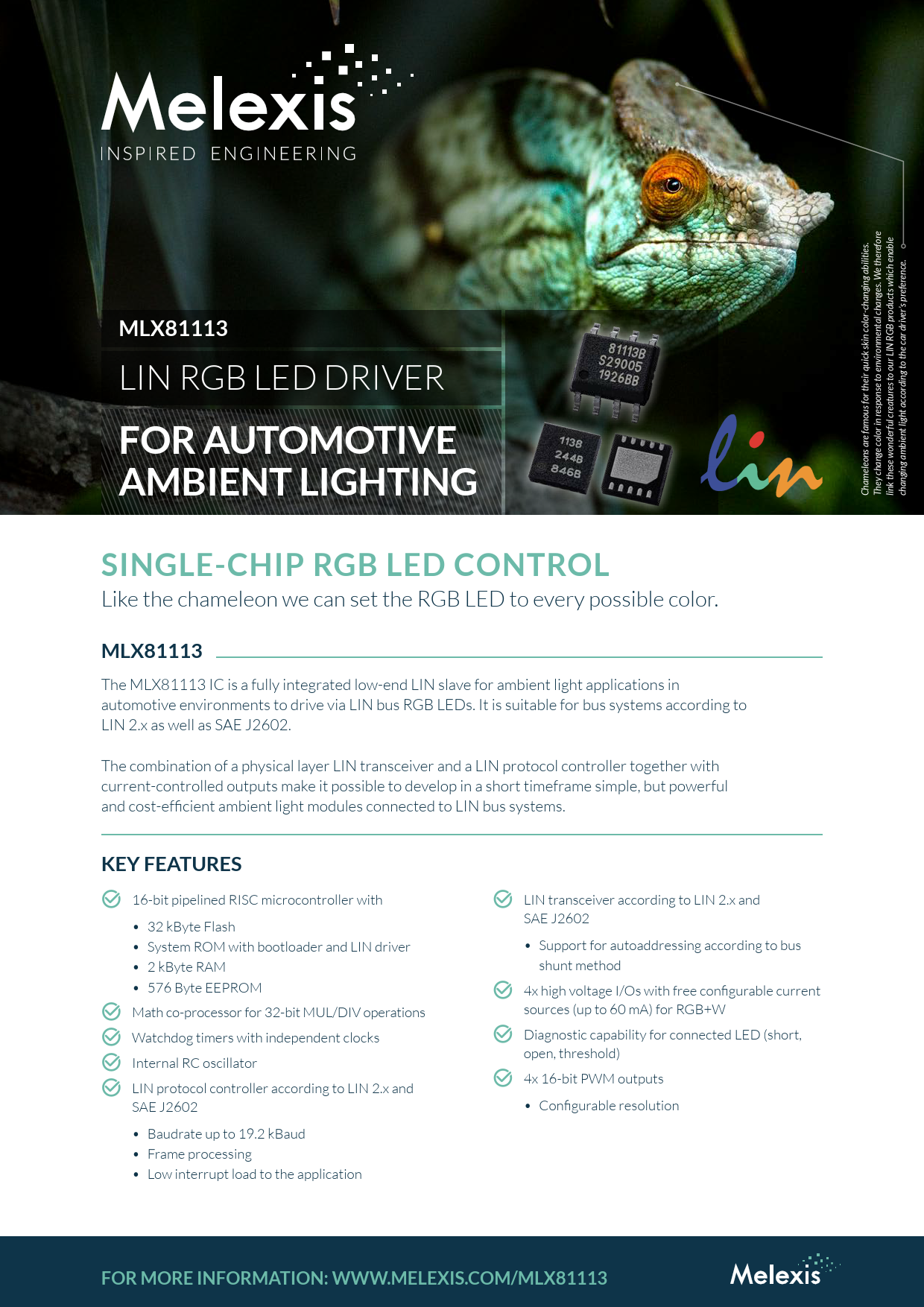 e efor e ther ence. efer oducts which enable er’s pr MLX81113 GB pr onmental changes. W LIN RGB LED DRIVER vir es to our LIN R ding to the car driv esponse to en eatur FOR AUTOMOTIVE e famous for their quick skin color-changing abilities. AMBIENT LIGHTING Chameleons ar They change color in r link these wonderful cr changing ambient light accor SINGLE-CHIP RGB LED CONTROL Like the chameleon we can set the RGB LED to every possible color. MLX81113 The MLX81113 IC is a fully integrated low-end LIN slave for ambient light applications in automotive environments to drive via LIN bus RGB LEDs. It is suitable for bus systems according to LIN 2.x as well as SAE J2602. The combination of a physical layer LIN transceiver and a LIN protocol controller together with current-controlled outputs make it possible to develop in a short timeframe simple, but powerful and cost-efficient ambient light modules connected to LIN bus systems. KEY FEATURES k 16-bit pipelined RISC microcontroller with k LIN transceiver according to LIN 2.x and SAE J2602 • 32 kByte Flash • System ROM with bootloader and LIN driver • Support for autoaddressing according to bus • 2 kByte RAM shunt method • 576 Byte EEPROM k 4x high voltage I/Os with free configurable current k Math co-processor for 32-bit MUL/DIV operations sources (up to 60 mA) for RGB+W k Watchdog timers with independent clocks k Diagnostic capability for connected LED (short, k open, threshold) Internal RC oscillator k k 4x 16-bit PWM outputs LIN protocol controller according to LIN 2.x and SAE J2602 • Configurable resolution • Baudrate up to 19.2 kBaud • Frame processing • Low interrupt load to the application FOR MORE INFORMATION: WWW.MELEXIS.COM/MLX81113