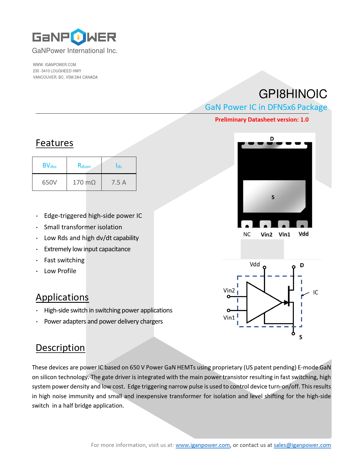 GaNPower International Inc. WWW. IGANPOWER.COM 230 -3410 LOUGHEED HWY VANCOUVER, BC, V5M 2A4 CANADA GPI8HINOIC GaN Power IC in DFN5x6 Package