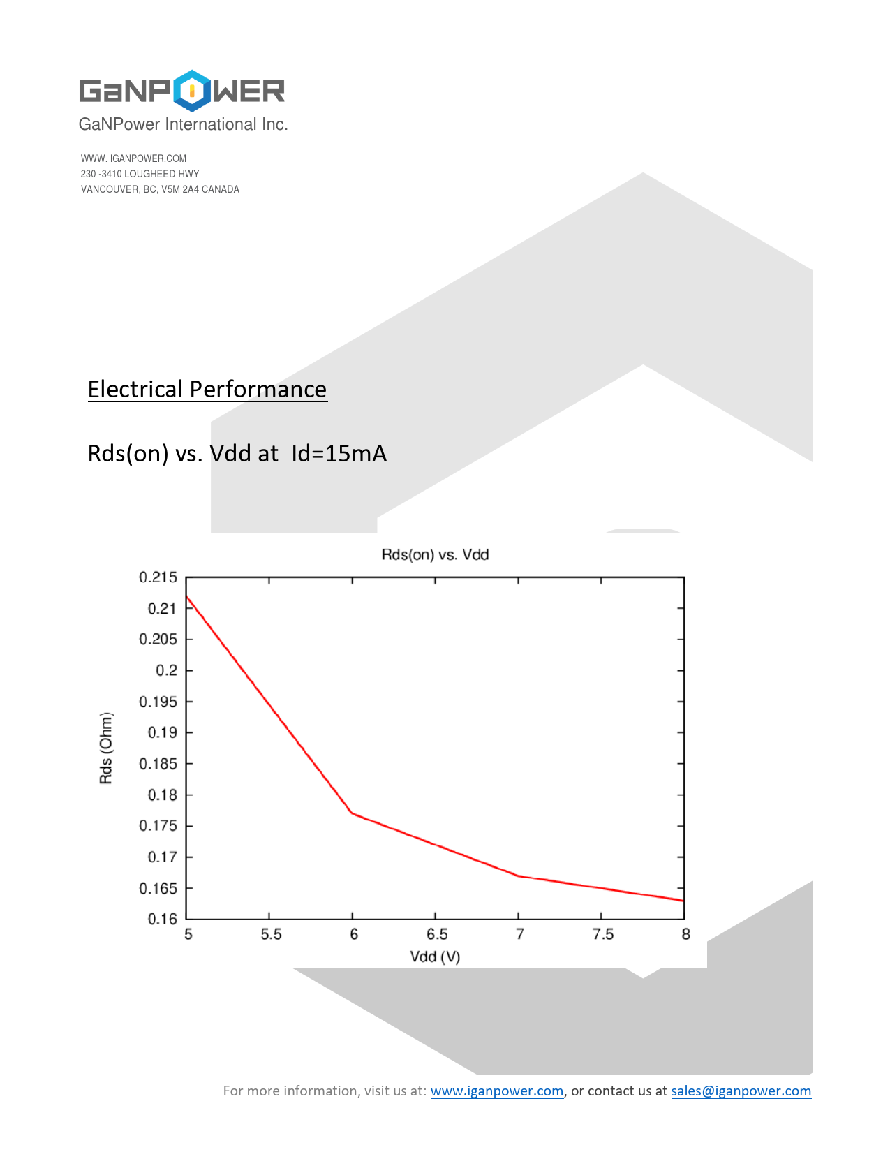 GaNPower International Inc. WWW. IGANPOWER.COM 230 -3410 LOUGHEED HWY VANCOUVER, BC, V5M 2A4 CANADA Electrical Performance Rds(on) vs. Vdd at Id=15mA For more information, visit us at: www.iganpower.com, or contact us at sales@iganpower.com