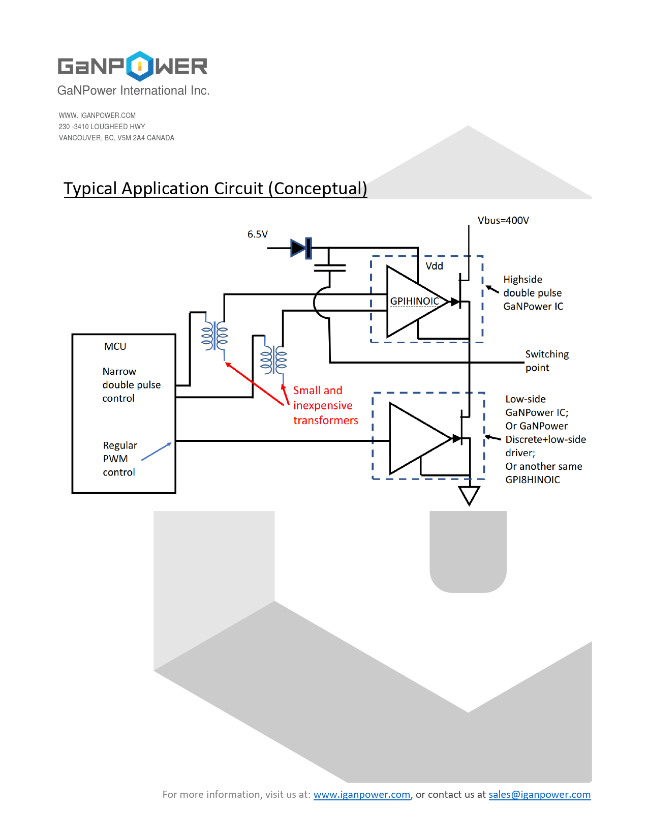 GaNPower International Inc. WWW. IGANPOWER.COM 230 -3410 LOUGHEED HWY VANCOUVER, BC, V5M 2A4 CANADA Typical Application Circuit (Conceptual) For more information, visit us at: www.iganpower.com, or contact us at sales@iganpower.com