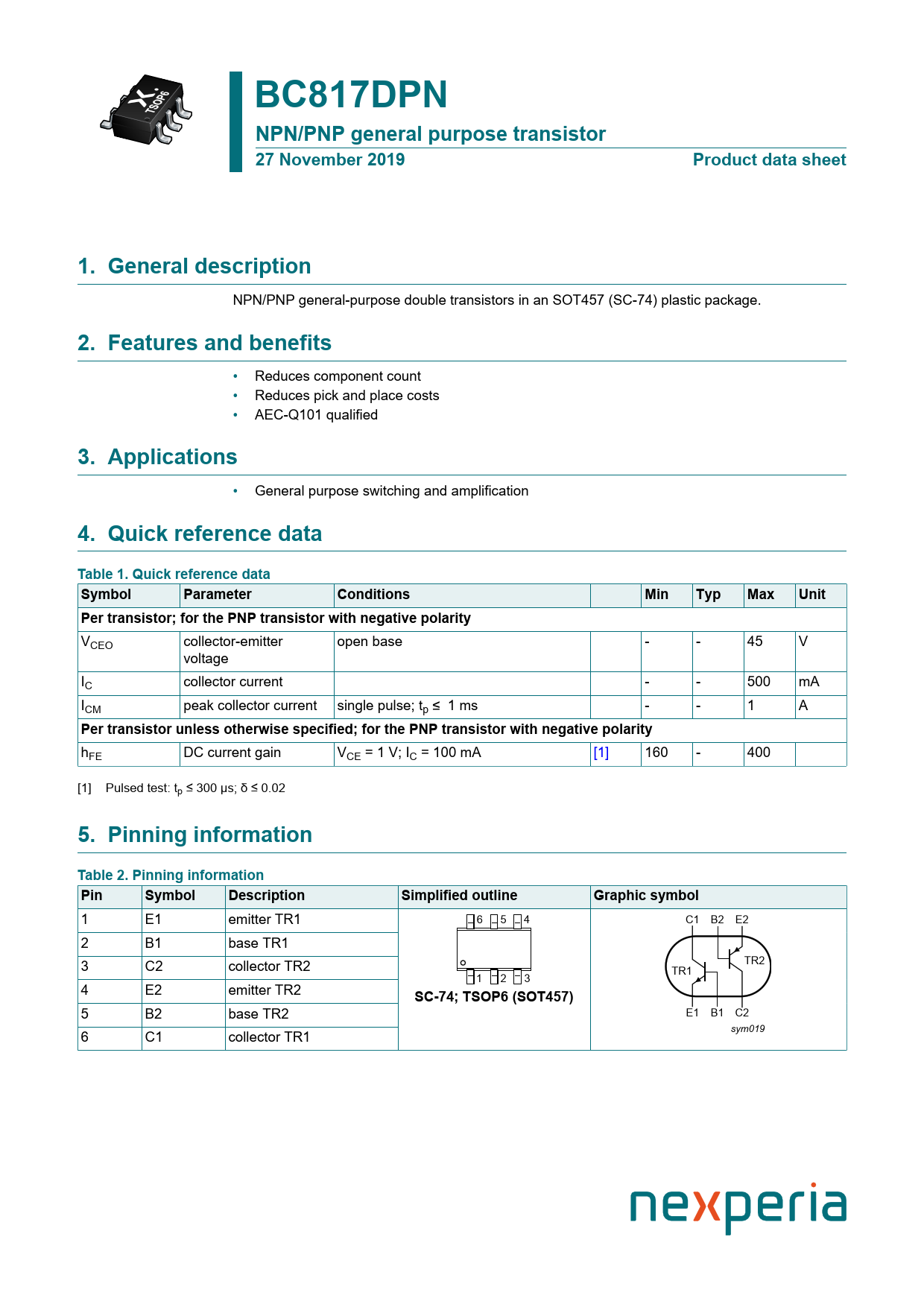BC817DPN. NPN/PNP general purpose transistor. 27 November 2019. Product data sheet. 1. General description