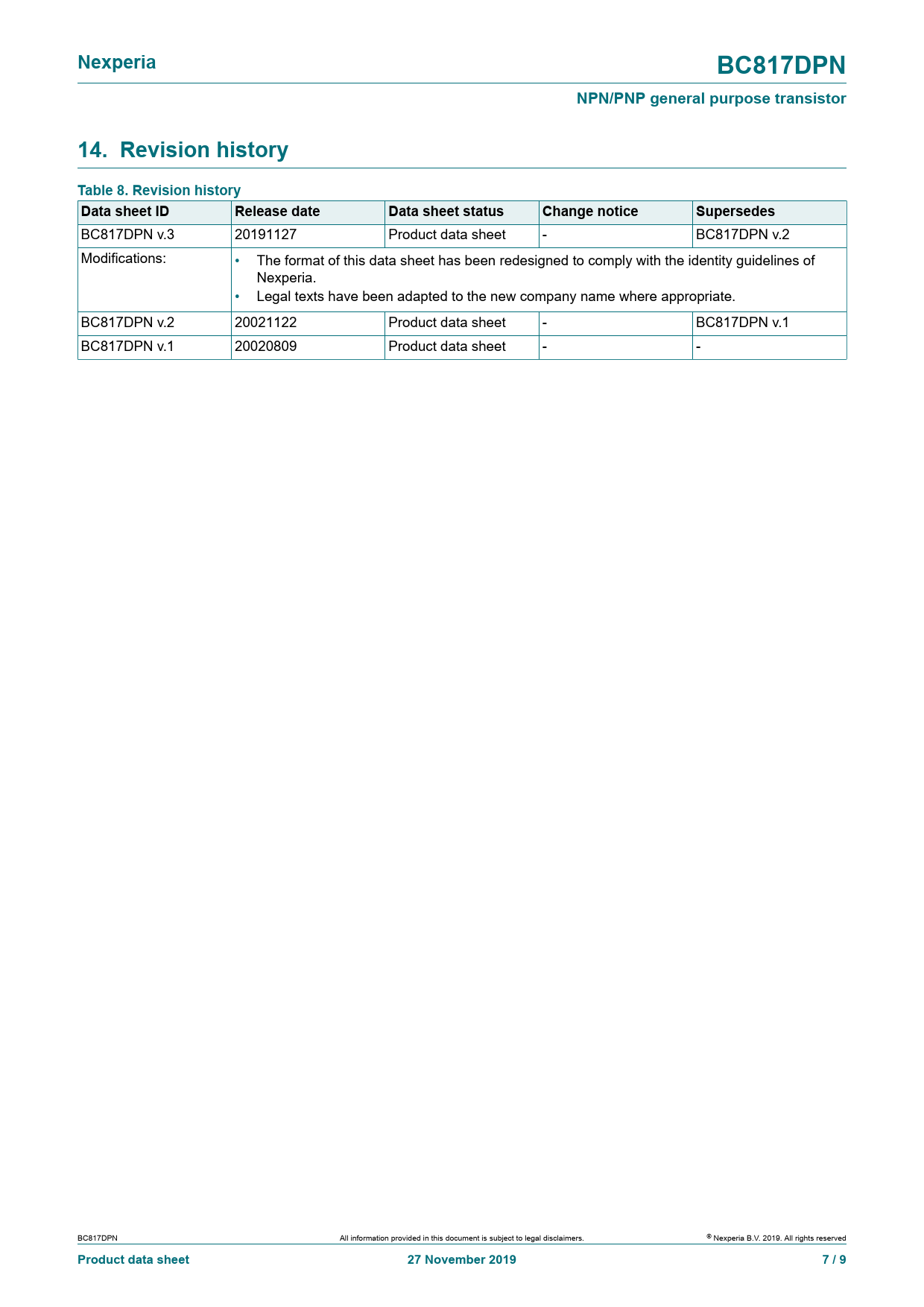 Nexperia. BC817DPN. NPN/PNP general purpose transistor. 14. Revision history Table 8. Revision history. Data sheet ID