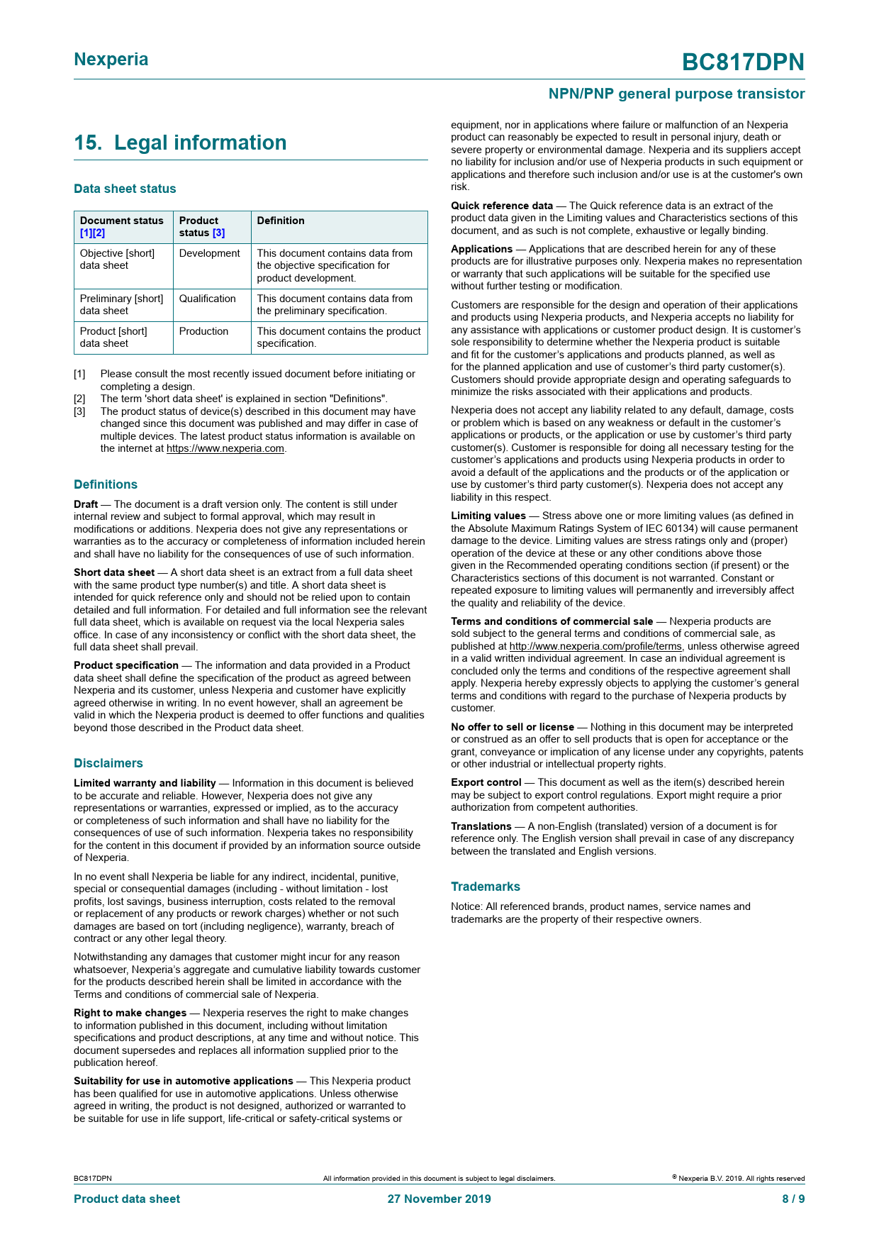 | Pages / Page | 9 / 8 — Nexperia. BC817DPN. NPN/PNP general purpose transistor. 15. Legal … |
