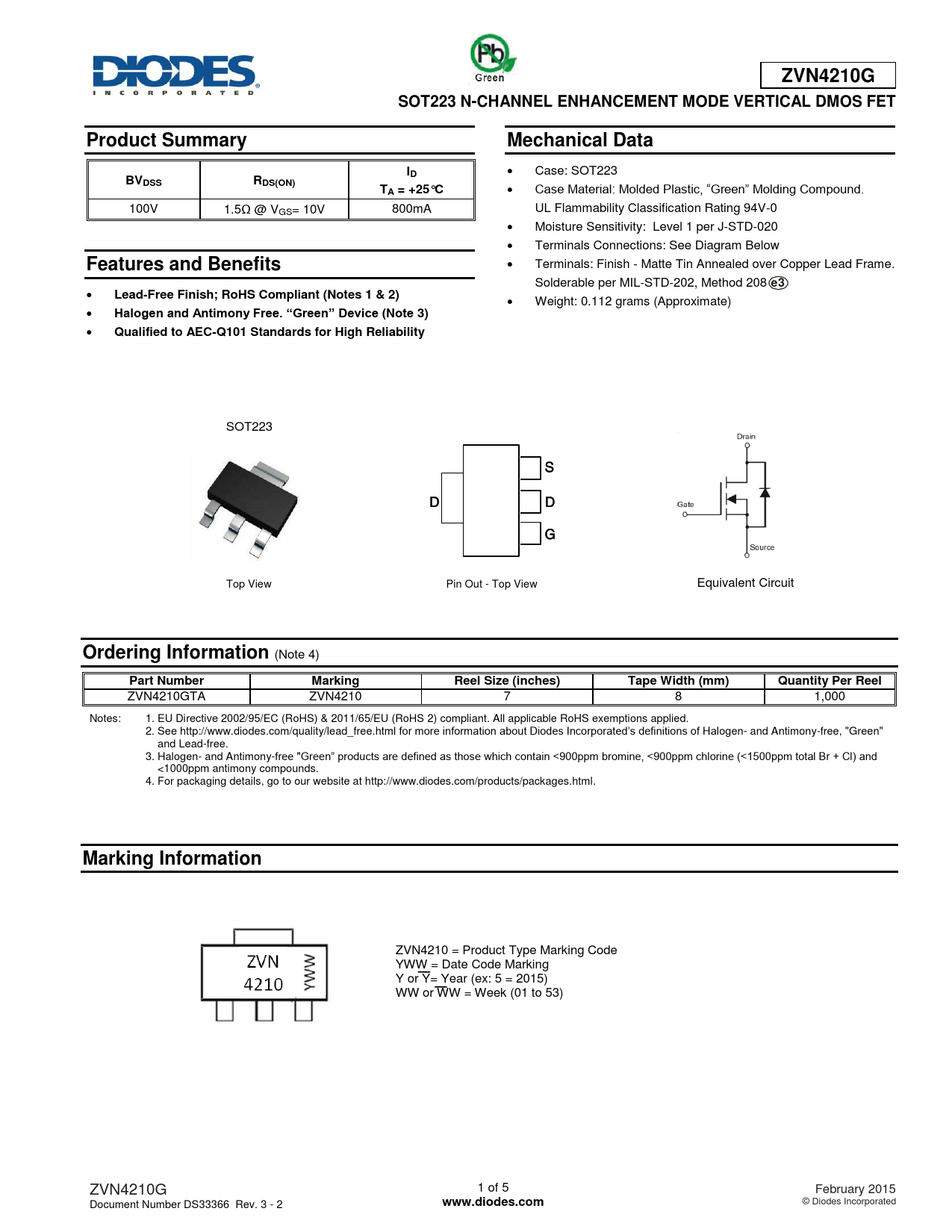 ZVN4210 = Product Type Marking Code YWW = Date Code Marking Y or Y= Year (ex: 5 = 2015) WW or WW = Week (01 to 53) ZVN4210G 1 of 5 February 2015 Document Number DS33366 Rev. 3 - 2