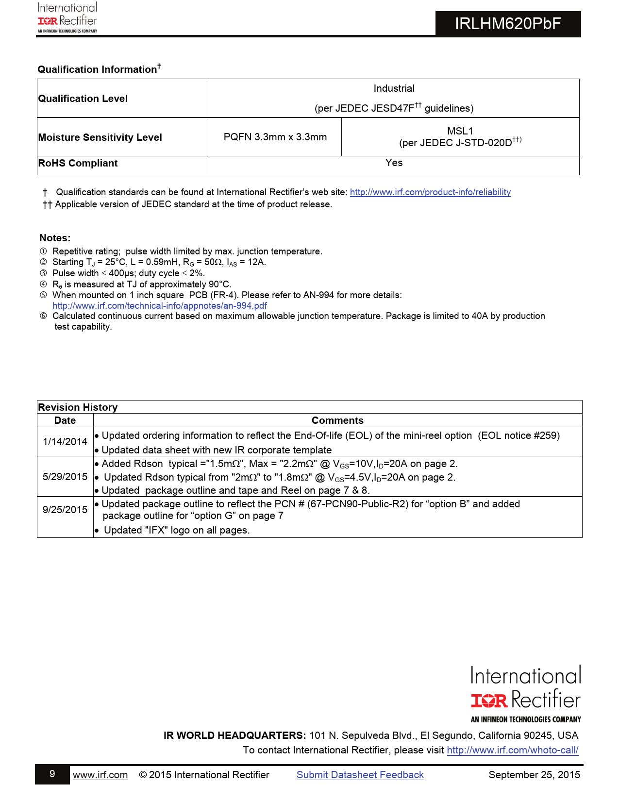 101 N. Sepulveda Blvd., El Segundo, California 90245, USA To contact International Rectifier, please visit http://www.irf.com/whoto-call/ 9 www.irf.com © 2015 International Rectifier Submit Datasheet Feedback September 25, 2015