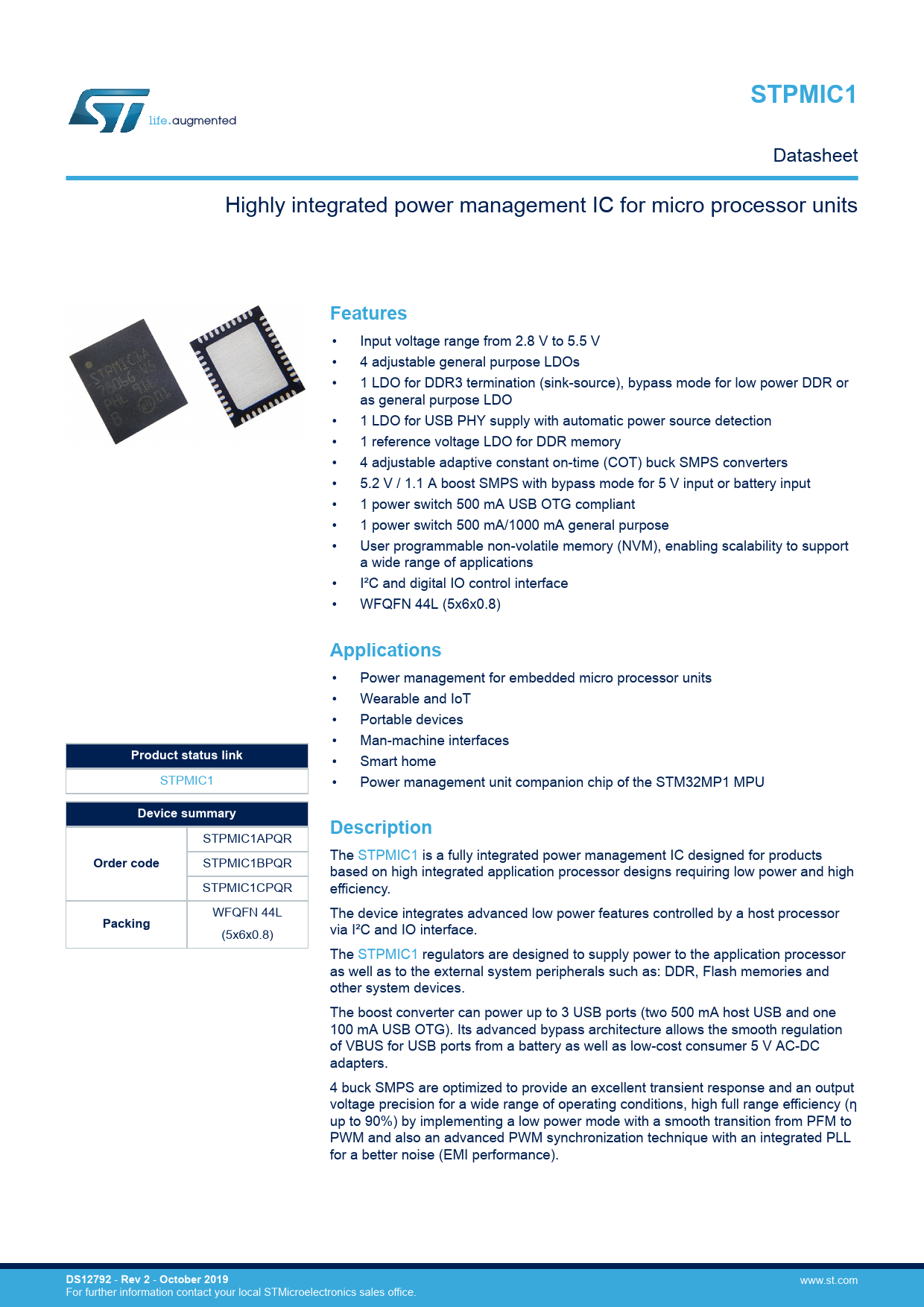 STPMIC1. Features. Applications. Product status link. Device summary. Description. Order code. Packing. DS12792. Rev 2. October 2019