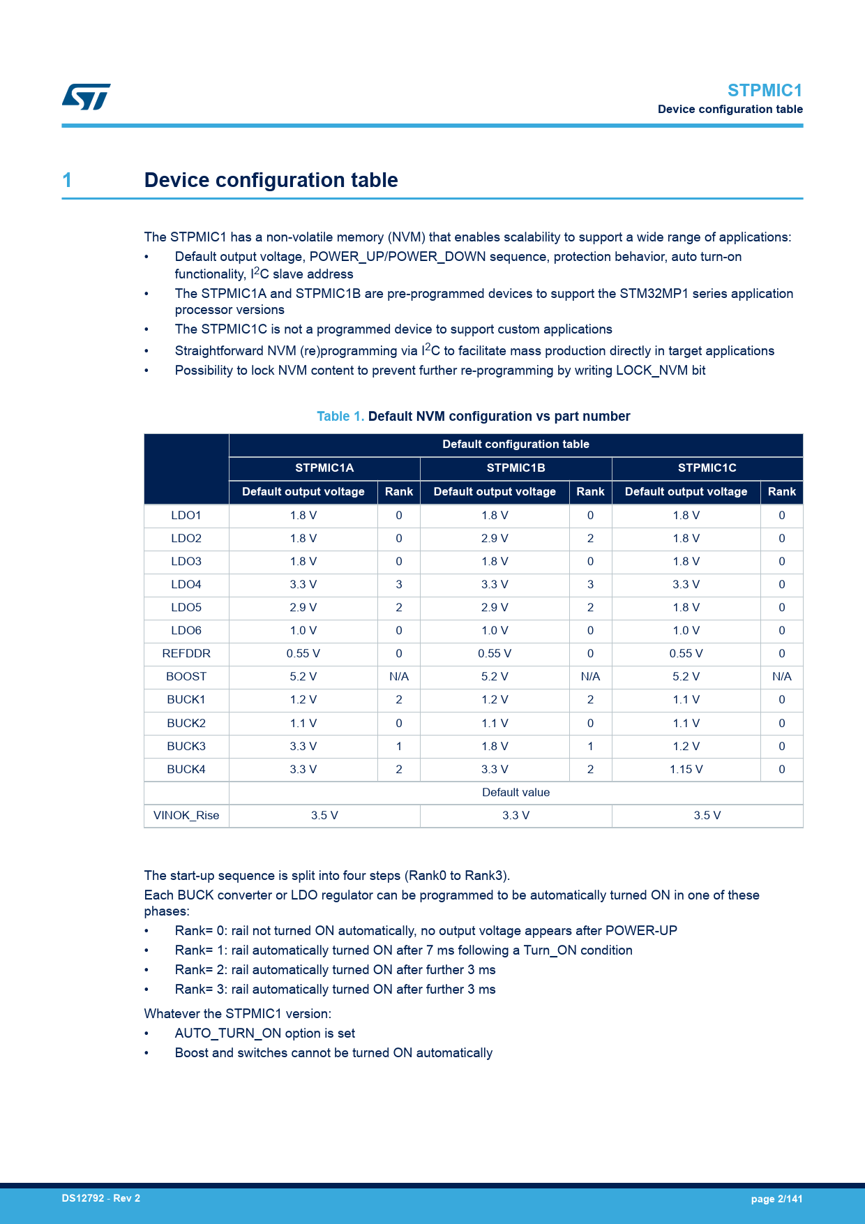 Pages / Page141 / 2 — STPMIC1. Device configuration table. Table 1. Default NVM configuration …