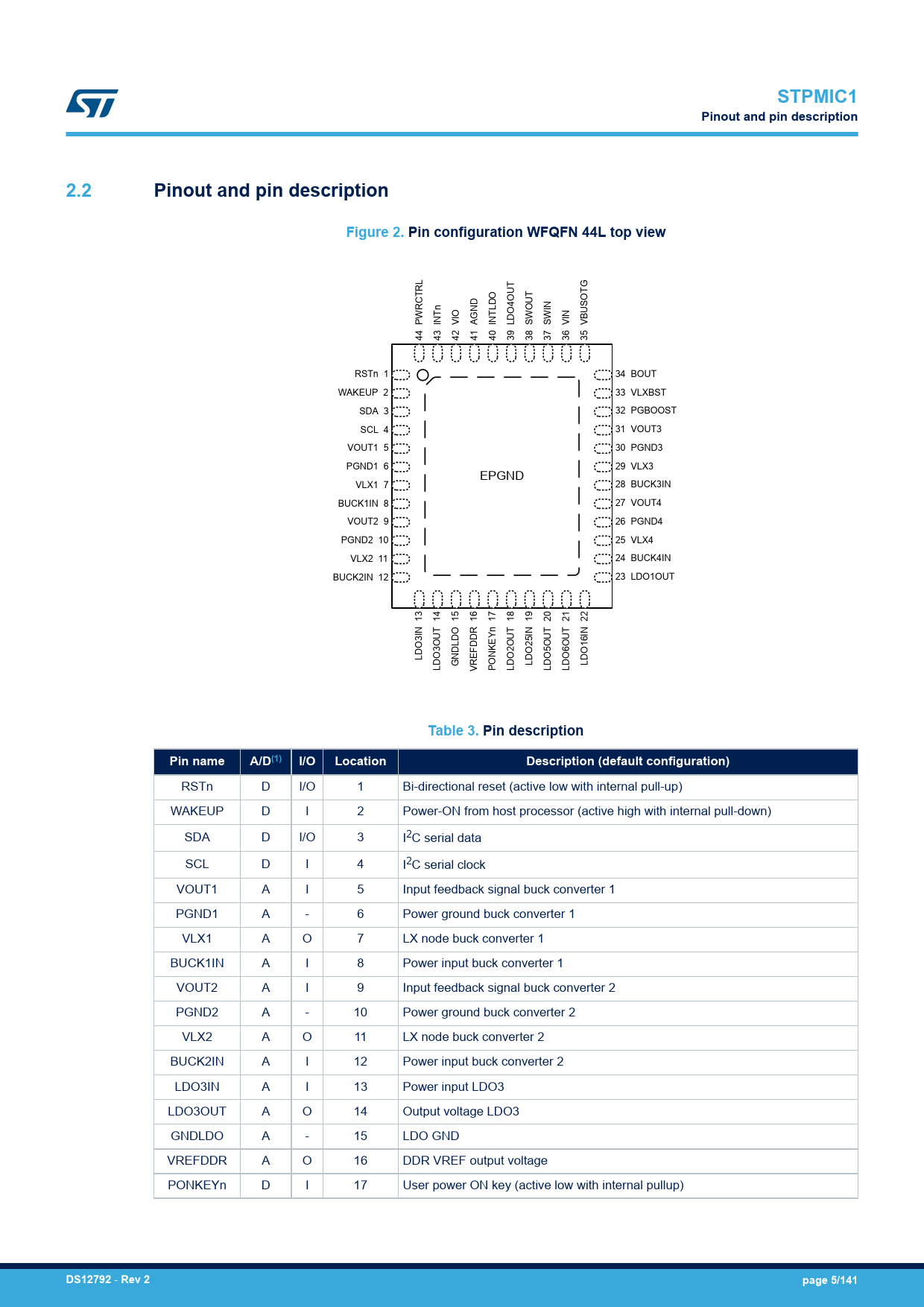STPMIC1. Pinout and pin description. 2.2. Figure 2. Pin configuration WFQFN 44L top view. Table 3. Pin description. Pin name