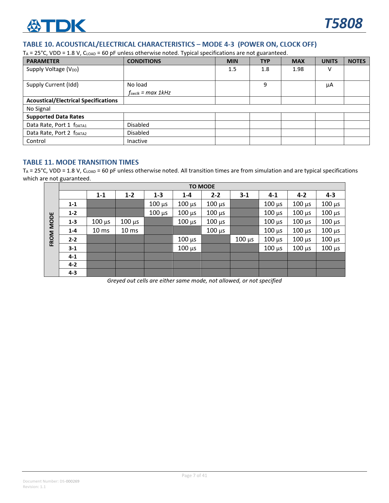 T5808. TABLE 10. ACOUSTICAL/ELECTRICAL CHARACTERISTICS – MODE 4-3 (POWER ON, CLOCK OFF). PARAMETER. CONDITIONS. MIN. TYP. MAX. UNITS