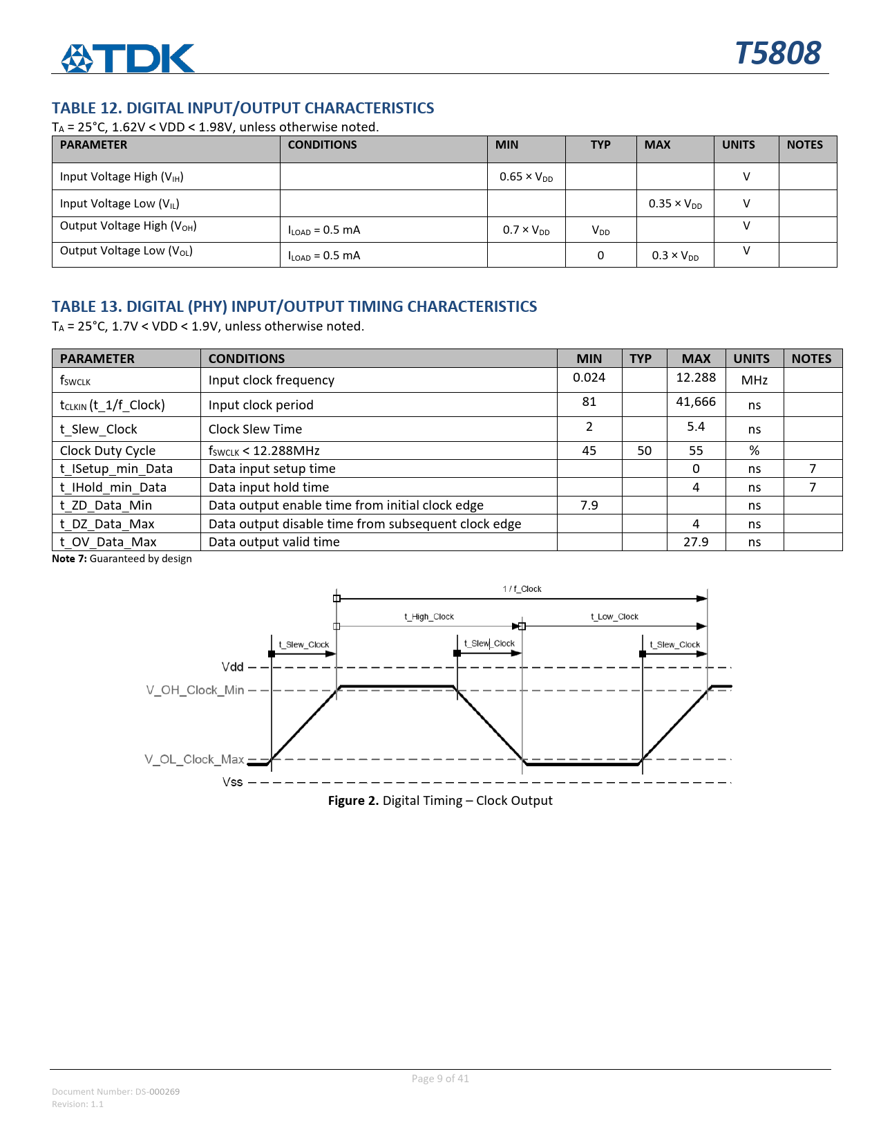| Pages / Page | 41 / 9 — T5808. TABLE 12. DIGITAL INPUT/OUTPUT CHARACTERISTICS. PARAMETER. … |