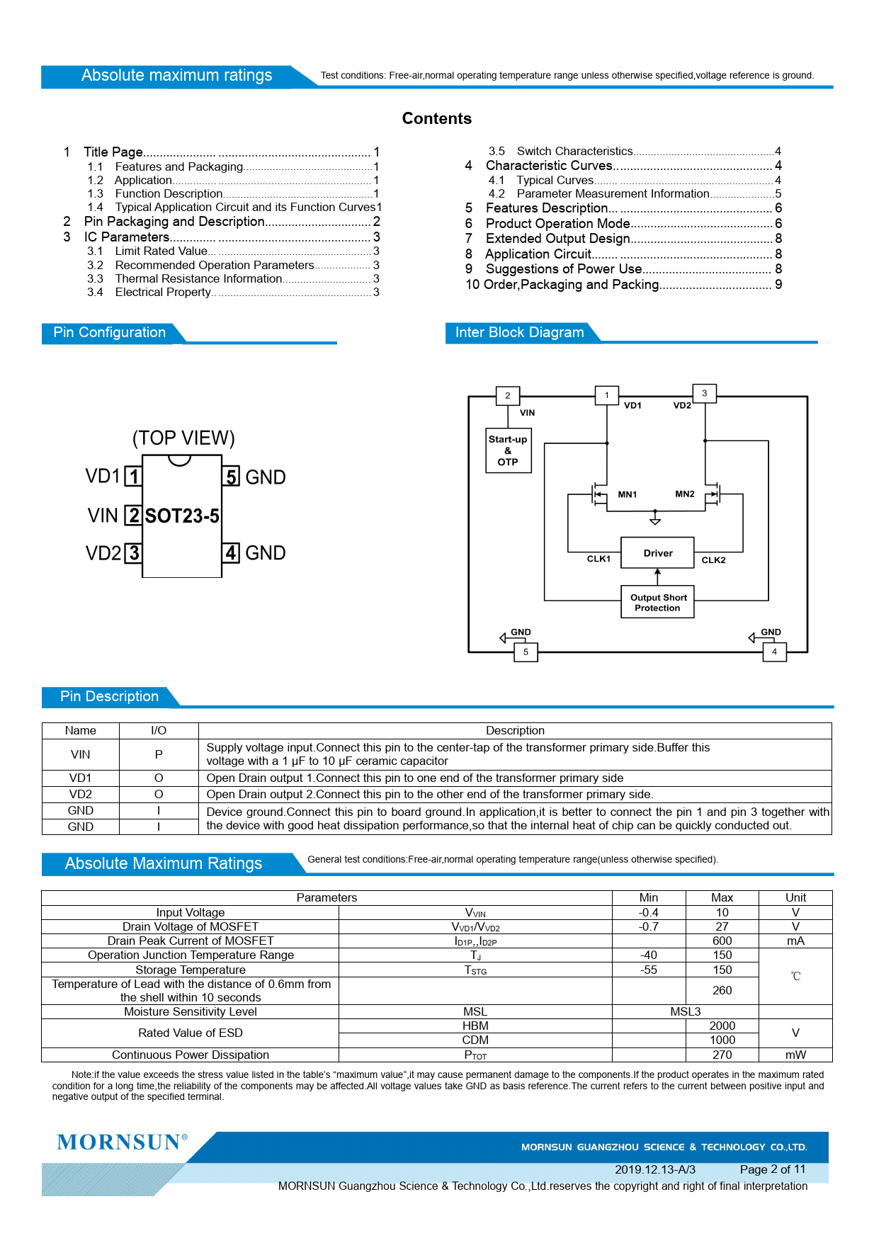 1 Title Page. 1 3.5 Switch Characteristics. 4 1.1 Features and Packaging. 1 4 Characteristic Curves. 4 1.2 Application. 1 4.1 Typical Curves. 4 1.3 Function Description. .1 4.2 Parameter Measurement Information. 5 1.4 Typical Application Circuit and its Function Curves1 5 Features Description. 6 2 Pin Packaging and Description. 2 6 Product Operation Mode. .6 3 IC Parameters. 3 7 Extended Output Design. .8 3.1 Limit Rated Value. 3 8 Application Circuit. 8 3.2 Recommended Operation Parameters. 3 9 Suggestions of Power Use. 8 3.3 Thermal Resistance Information. 3 3.4 Electrical Property. 3 10 Order,Packaging and Packing. 9 Pin Configuration Inter Block Diagram Pin Description Name I/O Description VIN P Supply voltage input.Connect this pin to the center-tap of the transformer primary side.Buffer this voltage with a 1 μF to 10 μF ceramic capacitor VD1 O Open Drain output 1.Connect this pin to one end of the transformer primary side VD2 O Open Drain output 2.Connect this pin to the other end of the transformer primary side. GND I Device ground.Connect this pin to board ground.In application,it is better to connect the pin 1 and pin 3 together with GND I the device with good heat dissipation performance,so that the internal heat of chip can be quickly conducted out. General test conditions:Free-air,normal operating temperature range(unless otherwise specified). Absolute Maximum Ratings Parameters Min Max Unit Input Voltage VVIN -0.4 10 V Drain Voltage of MOSFET VVD1/VVD2 -0.7 27 V Drain Peak Current of MOSFET ID1P,,ID2P 600 mA Operation Junction Temperature Range TJ -40 150 Storage Temperature TSTG -55 150 ℃ Temperature of Lead with the distance of 0.6mm from the shel within 10 seconds 260 Moisture Sensitivity Level MSL MSL3 Rated Value of ESD HBM 2000 V CDM 1000 Continuous Power Dissipation PTOT 270 mW Note:if the value exceeds the stress value listed in the table’s “maximum value”,it may cause permanent damage to the components.If the product operates in the maximum rated condition for a long time,the reliability of the components may be affected.Al voltage values take GND as basis reference.The current refers to the current between positive input and negative output of the specified terminal. 2019.12.13-A/3 Page 2 of 11 MORNSUN Guangzhou Science & Technology Co.,Ltd.reserves the copyright and right of final interpretation Document Outline Mornsun Guangzhou Science & Technology Co.,Ltd.