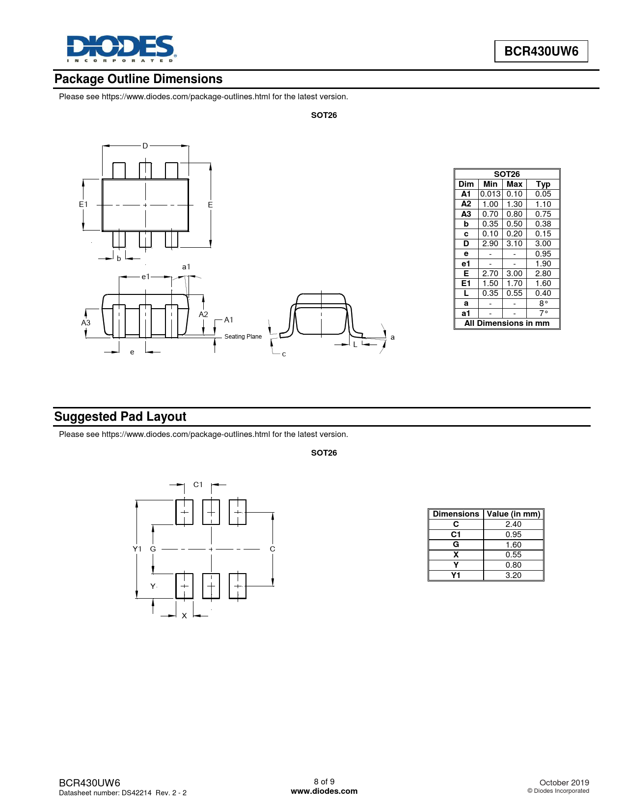 BCR430UW6. Package Outline Dimensions. SOT26. Dim Min Max. Typ. All Dimensions in mm. Suggested Pad Layout. Dimensions Value (in mm)