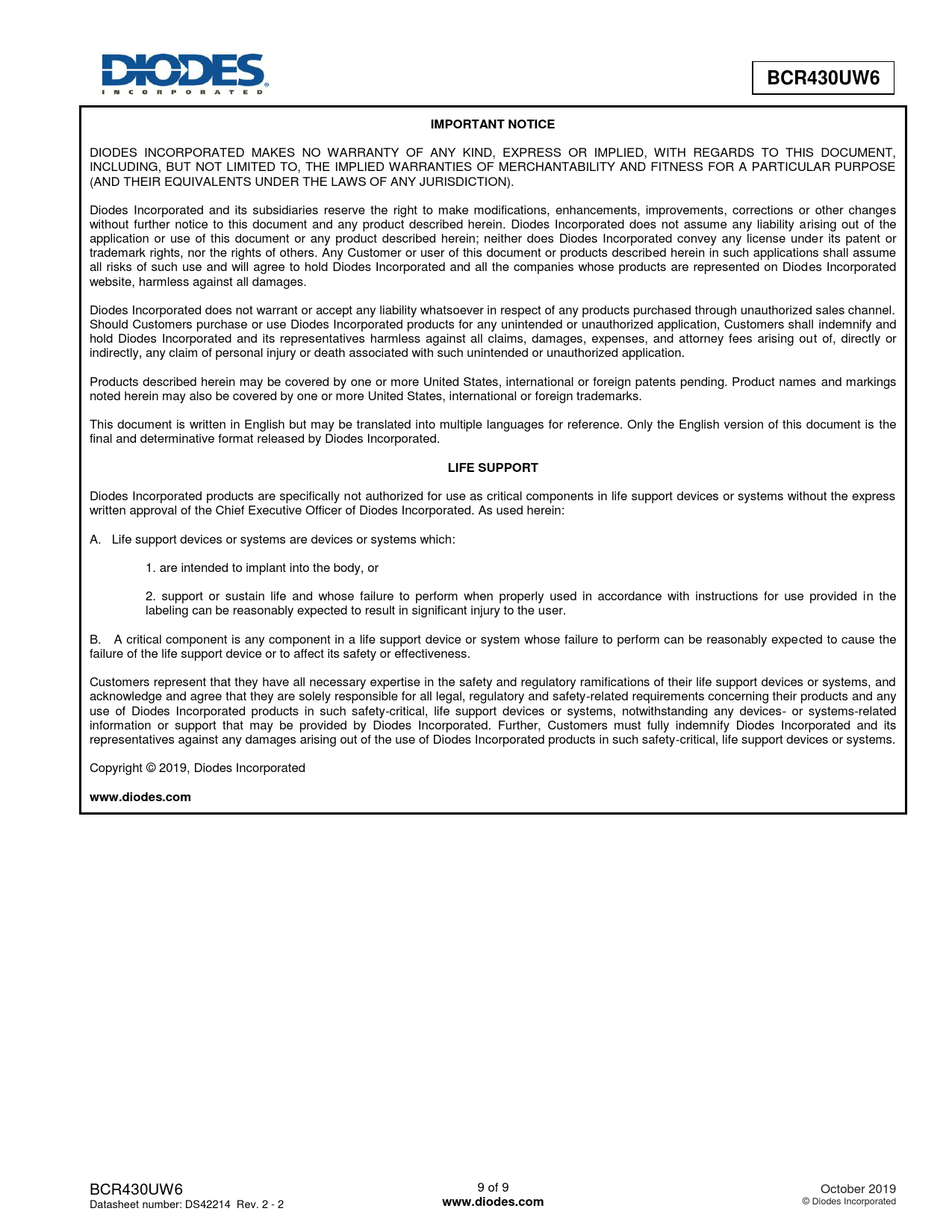 | Pages / Page | 9 / 9 — BCR430UW6. IMPORTANT NOTICE. LIFE SUPPORT. www.diodes.com |