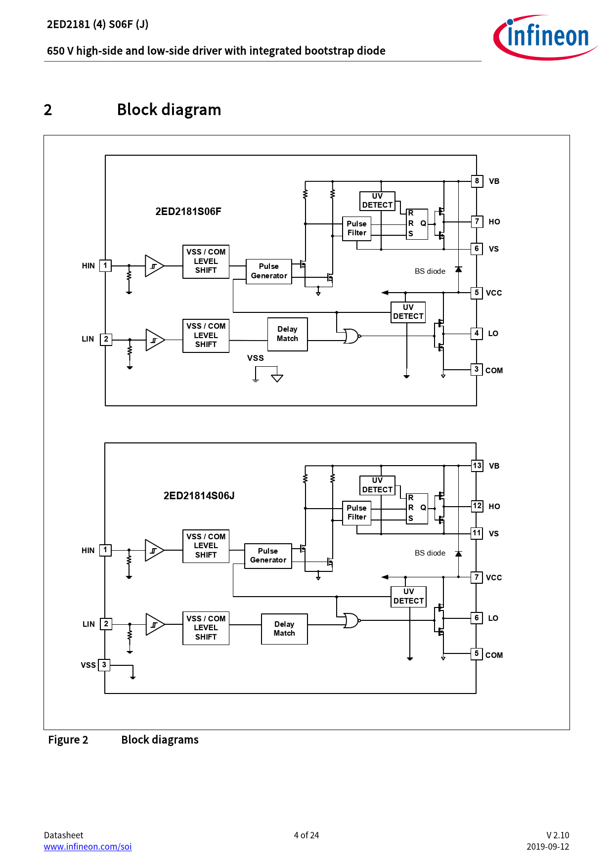 Model Line for this Datasheet Text Version of Document 2ED2181 (4) S06F (J) 650 V high-side and low-side driver with integrated bootstrap diode 2 Block diagram8 VB UV DETECT 2ED2181S06F R R Q 7 Pulse HO Filter S 6 VS VSS / COM HIN 1 LEVEL Pulse SHIFT Generator BS diode5 VCC UV DETECT VSS / COM Delay LEVEL 4 LIN 2 Match LO SHIFT VSS 3 COM 13 VB UV DETECT 2ED21814S06J R R Q 12 Pulse HO Filter S 11 VS VSS / COM HIN 1 LEVEL Pulse SHIFT BS diodeGenerator 7 VCC UV DETECT VSS / COM 6 LO LIN 2 Delay LEVEL Match SHIFT 5 COM VSS 3 Figure 2 Block diagrams Datasheet 4 of 24 V 2.10 www.infineon.com/soi 2019-09-12 Document Outline Features Product summary Product validation Description 1 Table of contents 2 Block diagram 3 Pin configuration and functionality 3.1 Pin configuration 3.2 Pin functionality 4 Electrical parameters 4.1 Absolute maximum ratings 4.2 Recommended operating conditions 4.3 Static electrical characteristics 4.4 Dynamic electrical characteristics 5 Application information and additional details 5.1 IGBT / MOSFET gate drive 5.2 Switching and timing relationships 5.3 Matched propagation delays 5.4 Input logic compatibility 5.5 Undervoltage lockout 5.6 Bootstrap diode 5.7 Calculating the bootstrap capacitance CBS 5.8 Tolerant to negative tranisents on input pins 5.9 Negative voltage transient tolerance of VS pin 5.10 NTSOA – Negative Transient Safe Operating Area 5.11 Higher headroom for input to output signal transmission with logic operation upto -11 V 5.12 Maximum switching frequency 5.13 PCB layout tips 6 Qualification information0F 7 Related products 8 Package details 9 Part marking information 10 Additional documentation and resources 10.1 Infineon online forum resources 11 Revision history