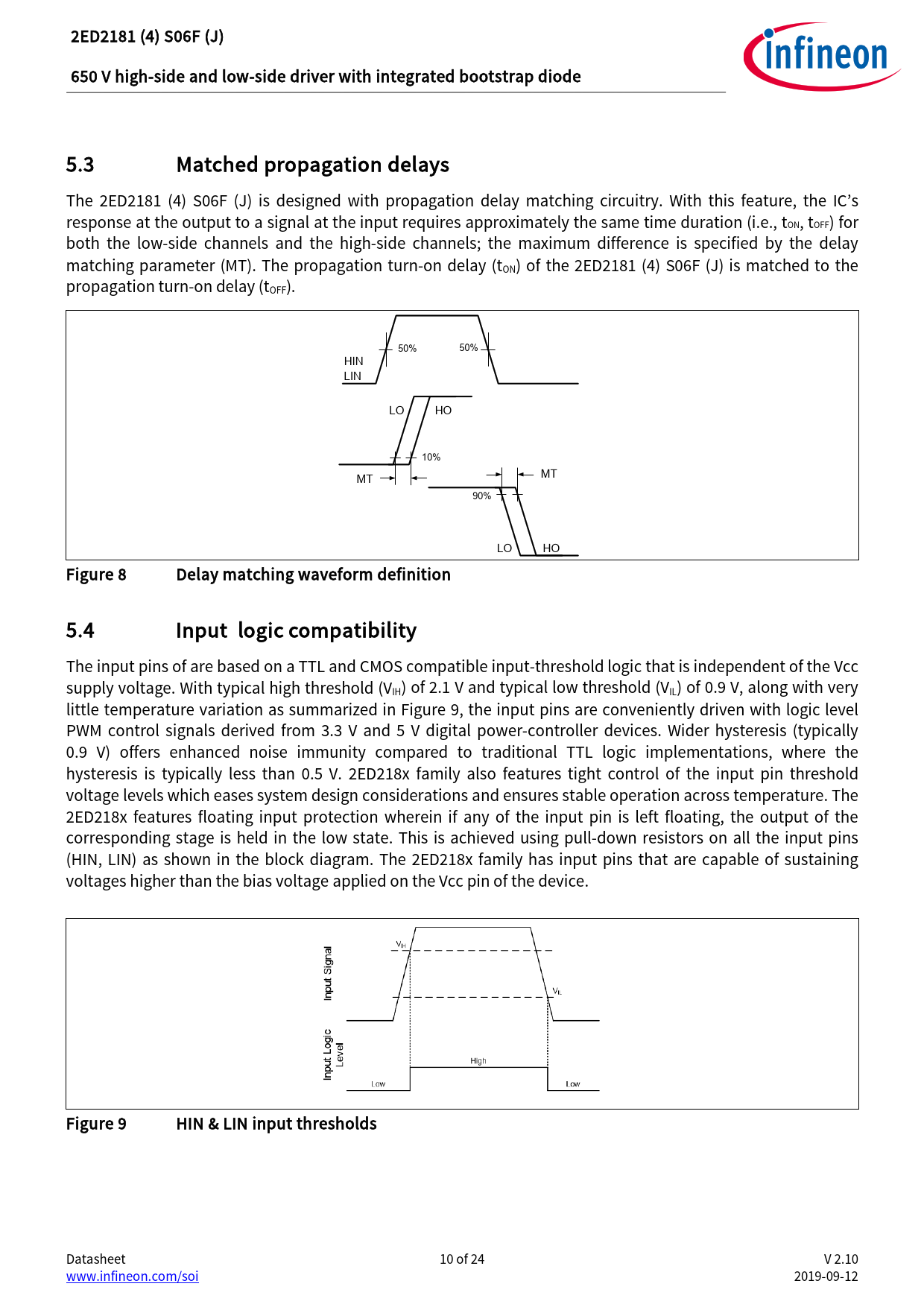 2ED2181 (4) S06F (J) 650 V high-side and low-side driver with integrated bootstrap diode 5.3 Matched propagation delays The 2ED2181 (4) S06F (J) is designed with propagation delay matching circuitry. With this feature, the IC’s response at the output to a signal at the input requires approximately the same time duration (i.e., tON, tOFF) for both the low-side channels and the high-side channels; the maximum difference is specified by the delay matching parameter (MT). The propagation turn-on delay (tON) of the 2ED2181 (4) S06F (J) is matched to the propagation turn-on delay (tOFF). 50% 50% HIN LIN LO HO 10% MT MT 90% LO HO Figure 8 Delay matching waveform definition 5.4 Input logic compatibility The input pins of are based on a TTL and CMOS compatible input-threshold logic that is independent of the Vcc supply voltage. With typical high threshold (VIH) of 2.1 V and typical low threshold (VIL) of 0.9 V, along with very little temperature variation as summarized in Figure 9, the input pins are conveniently driven with logic level PWM control signals derived from 3.3 V and 5 V digital power-controller devices. Wider hysteresis (typical y 0.9 V) offers enhanced noise immunity compared to traditional TTL logic implementations, where the hysteresis is typically less than 0.5 V. 2ED218x family also features tight control of the input pin threshold voltage levels which eases system design considerations and ensures stable operation across temperature. The 2ED218x features floating input protection wherein if any of the input pin is left floating, the output of the corresponding stage is held in the low state. This is achieved using pull-down resistors on all the input pins (HIN, LIN) as shown in the block diagram. The 2ED218x family has input pins that are capable of sustaining voltages higher than the bias voltage applied on the Vcc pin of the device. Figure 9 HIN & LIN input thresholds Datasheet 10 of 24 V 2.10 www.infineon.com/soi 2019-09-12 Document Outline Features Product summary Product validation Description 1 Table of contents 2 Block diagram 3 Pin configuration and functionality 3.1 Pin configuration 3.2 Pin functionality 4 Electrical parameters 4.1 Absolute maximum ratings 4.2 Recommended operating conditions 4.3 Static electrical characteristics 4.4 Dynamic electrical characteristics 5 Application information and additional details 5.1 IGBT / MOSFET gate drive 5.2 Switching and timing relationships 5.3 Matched propagation delays 5.4 Input logic compatibility 5.5 Undervoltage lockout 5.6 Bootstrap diode 5.7 Calculating the bootstrap capacitance CBS 5.8 Tolerant to negative tranisents on input pins 5.9 Negative voltage transient tolerance of VS pin 5.10 NTSOA – Negative Transient Safe Operating Area 5.11 Higher headroom for input to output signal transmission with logic operation upto -11 V 5.12 Maximum switching frequency 5.13 PCB layout tips 6 Qualification information0F 7 Related products 8 Package details 9 Part marking information 10 Additional documentation and resources 10.1 Infineon online forum resources 11 Revision history